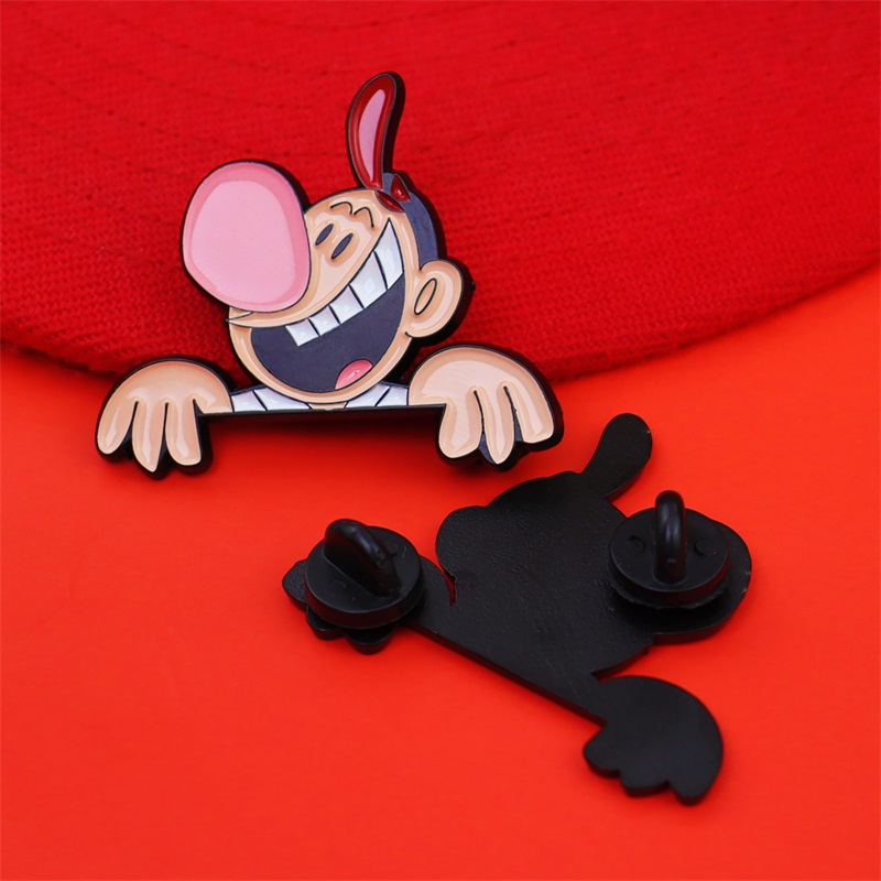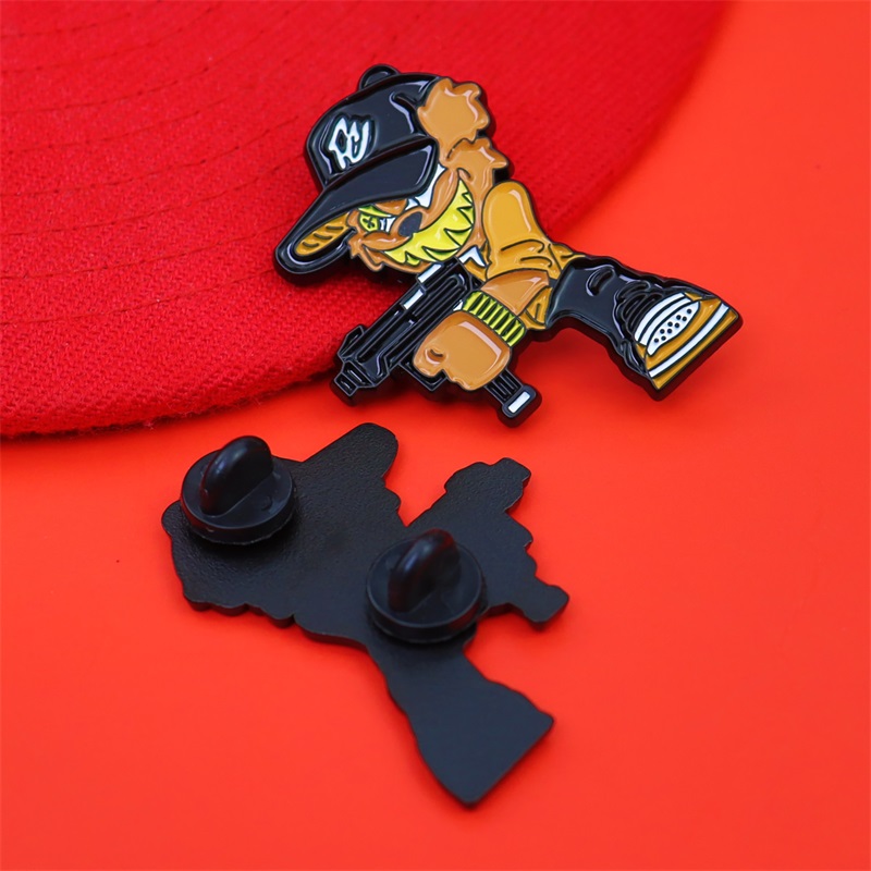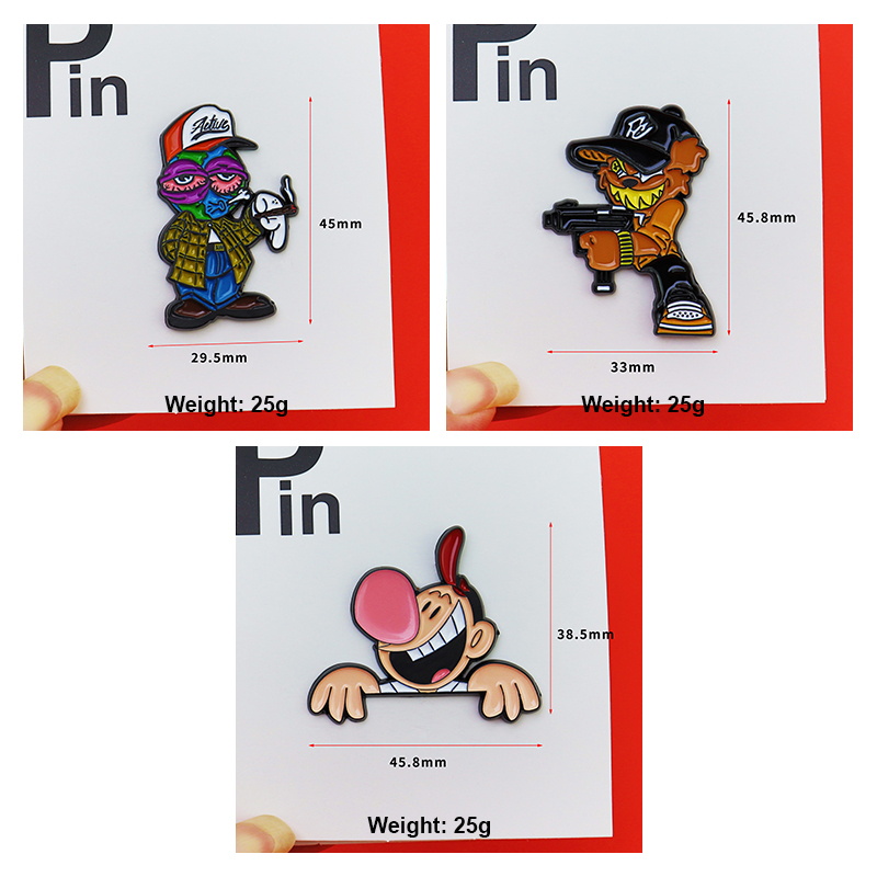 Bold cartoon-style designs (masked figure, clown, armed character) with vibrant hues, finished in sleek blackened metal. Durable soft enamel, 2D cutout shapes—edgy, eye-catching accessories for hats & bags.