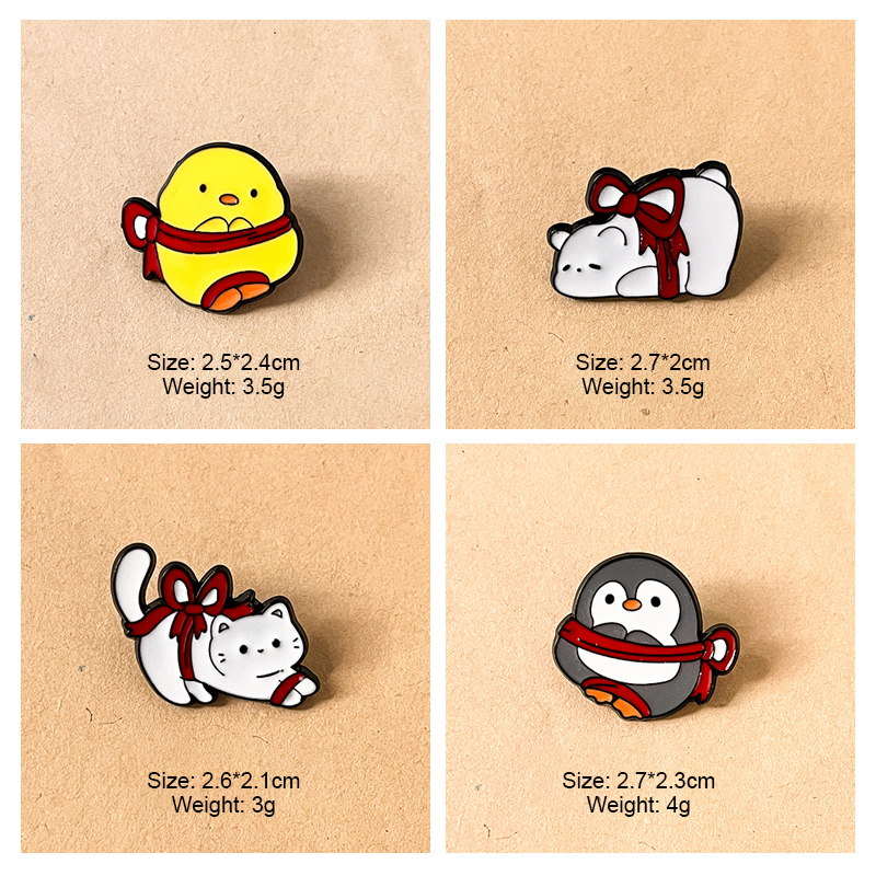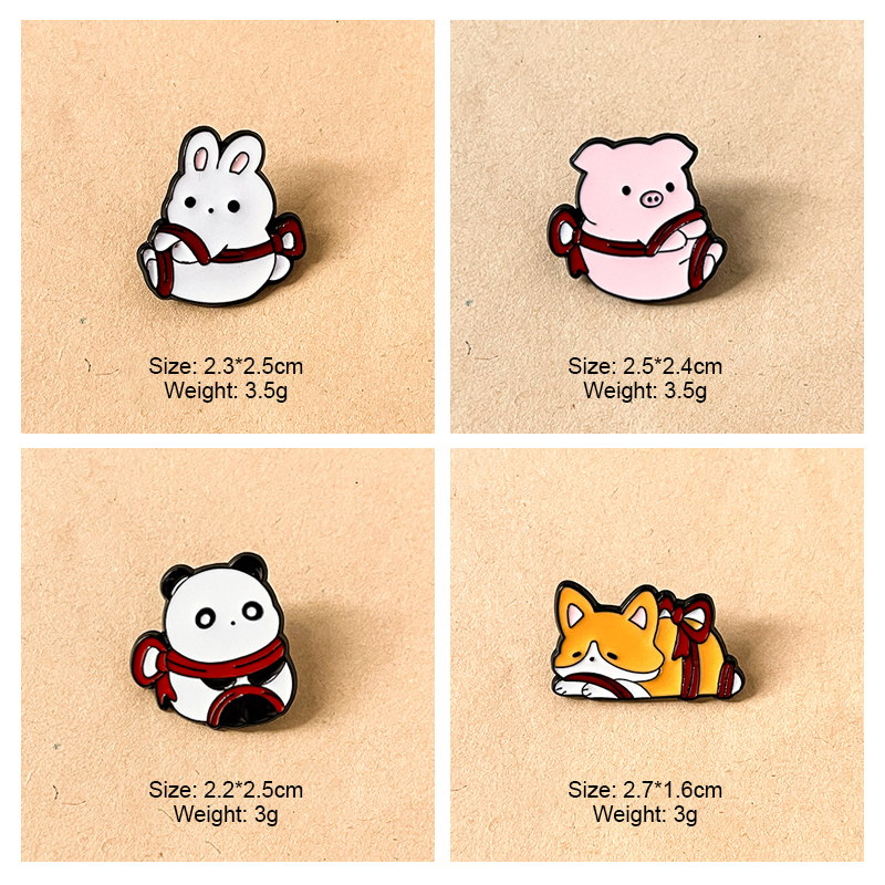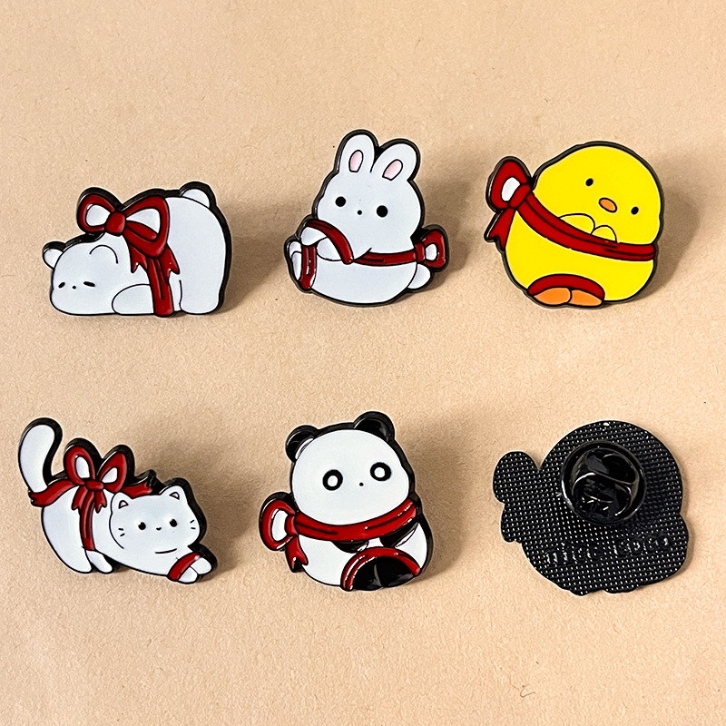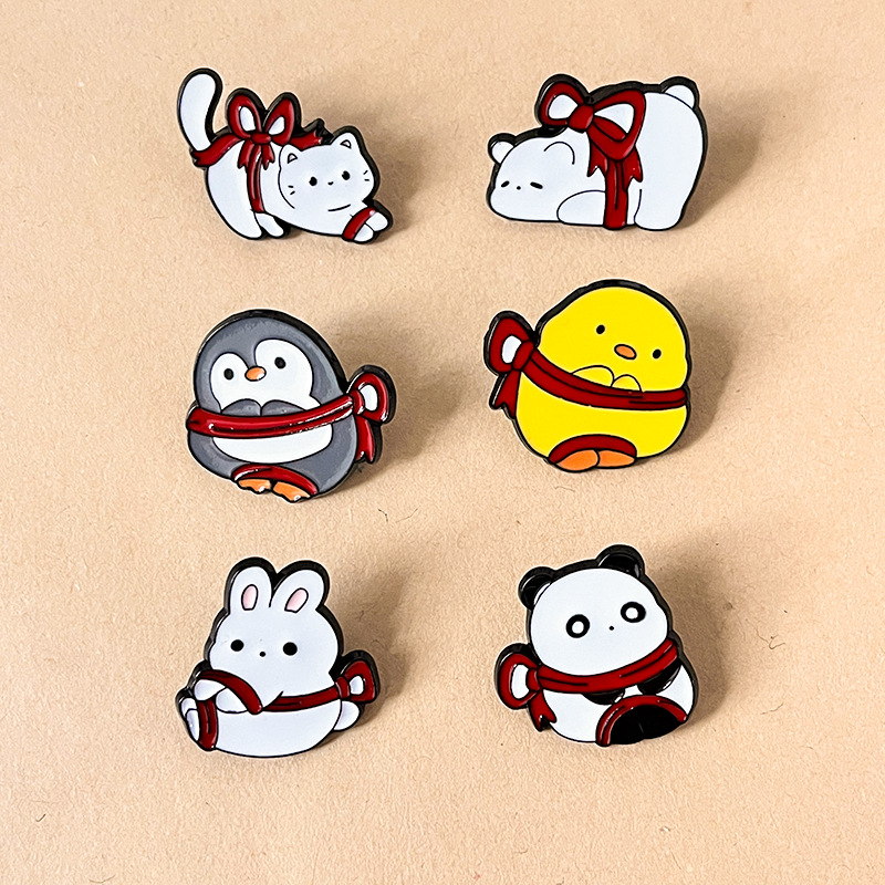 7 charming pins (rabbit, cat, corgi, etc.) wrapped in red bows—soft expressions, vivid enamel. Perfect for adding playful sweetness to bags/jackets; ideal for animal lovers’ cute collectibles.