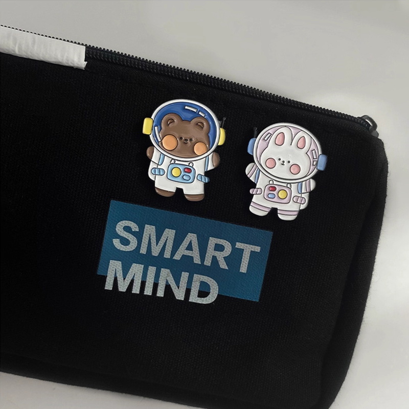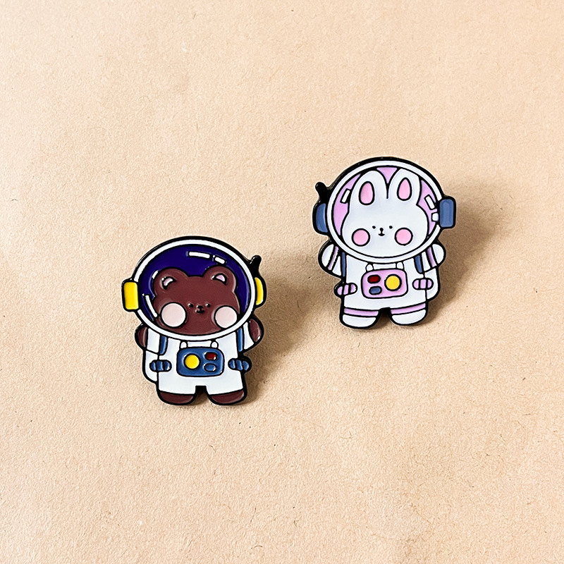2 cute space-themed pins (bear + rabbit in astronaut suits) — glossy enamel with crisp details, vibrant & durable. Perfect for adding whimsical cosmic flair to bags/jackets; ideal for daily wear or playful collectible decor.