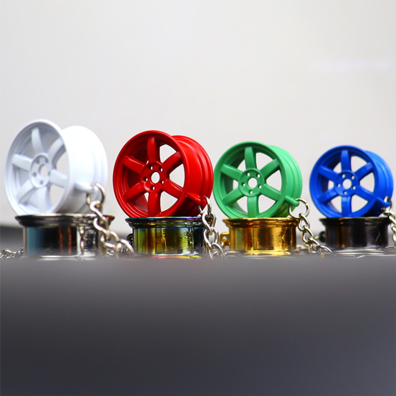 This keychain features miniature car wheel replicas in metal (white, green, black, rainbow, gold, red, silver, blue). With an automotive, rim-inspired design, the durable metallic construction appeals to car enthusiasts and those who love stylish, detailed auto accessories.