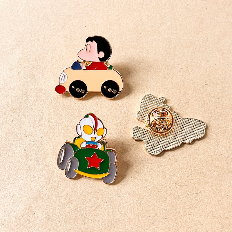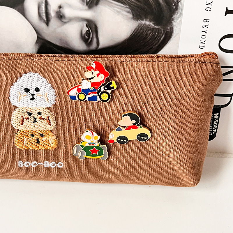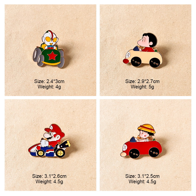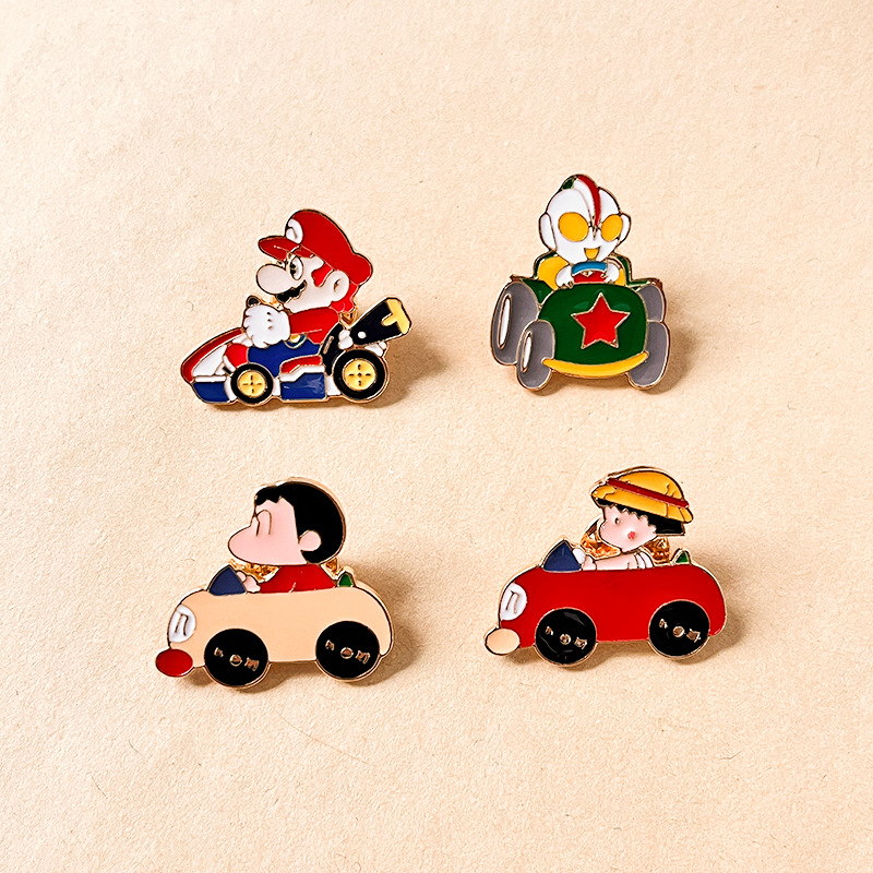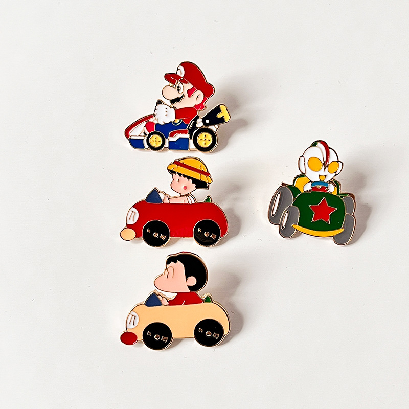 This vibrant 4-piece set features iconic characters (Mario, Ultraman, Shin-chan, Chibi Maruko-chan) in race cars. Nostalgic, playful designs add retro charm to gear—perfect for anime/gaming fans as whimsical, eye-catching collectible accessories.