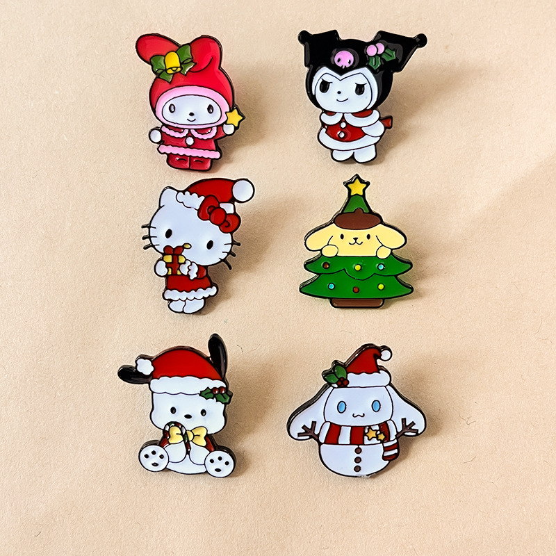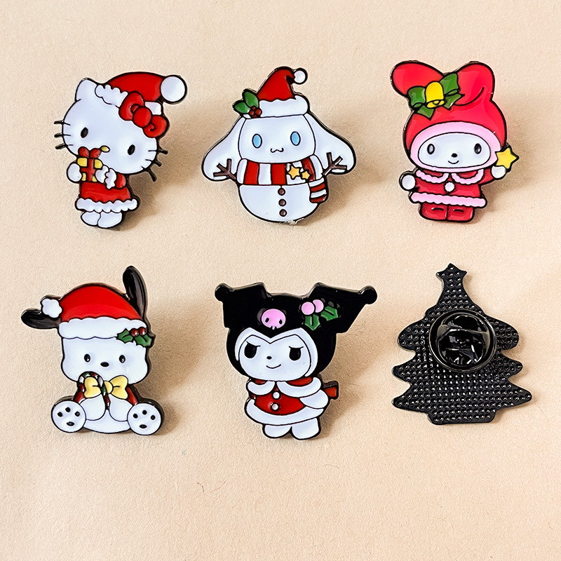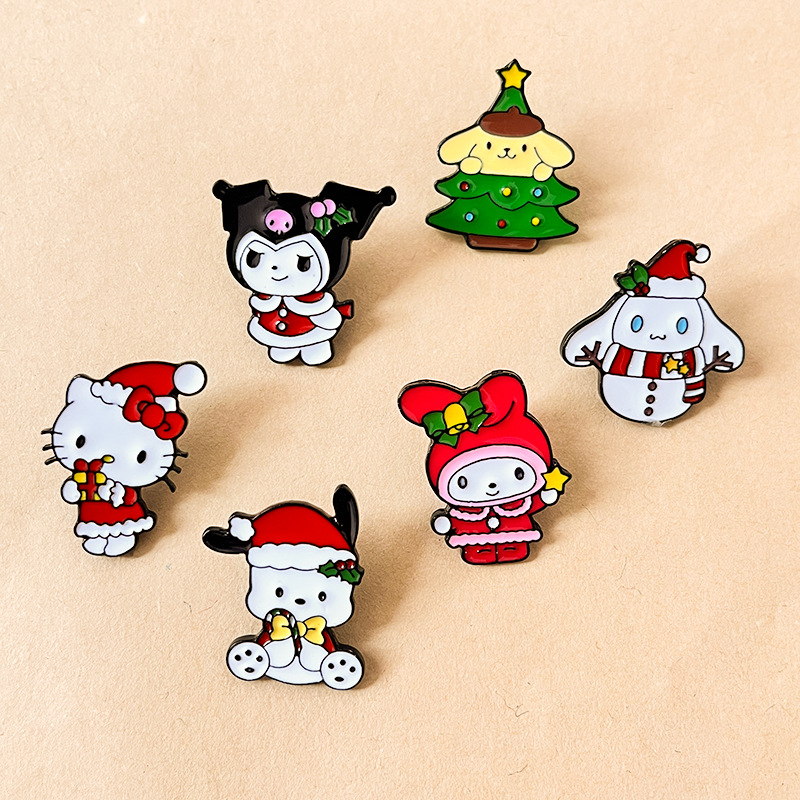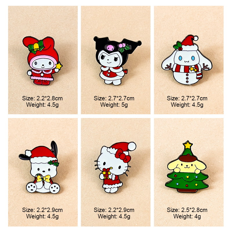 Features 6 holiday-themed Sanrio characters (Hello Kitty, My Melody, etc.) in Christmas attire—cheerful, iconic flair. Perfect for Sanrio fans to add festive charm to bags/jackets, ideal for seasonal styling or holiday decor.