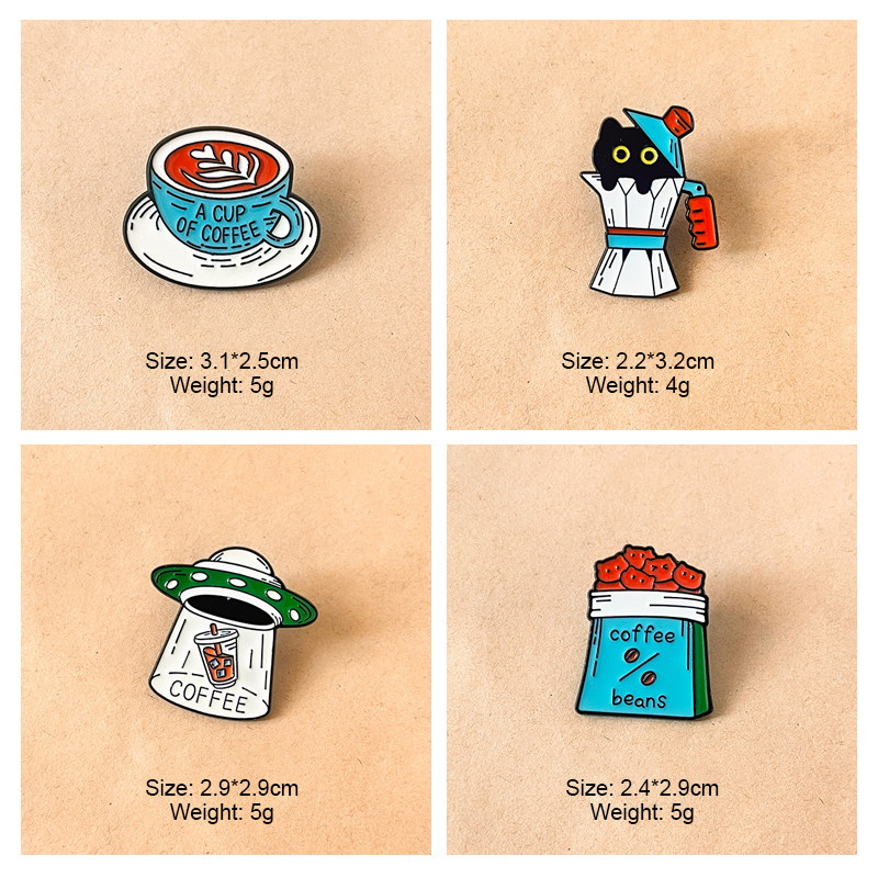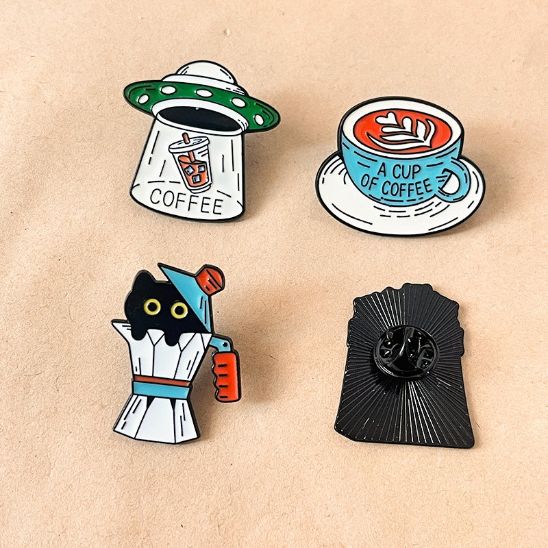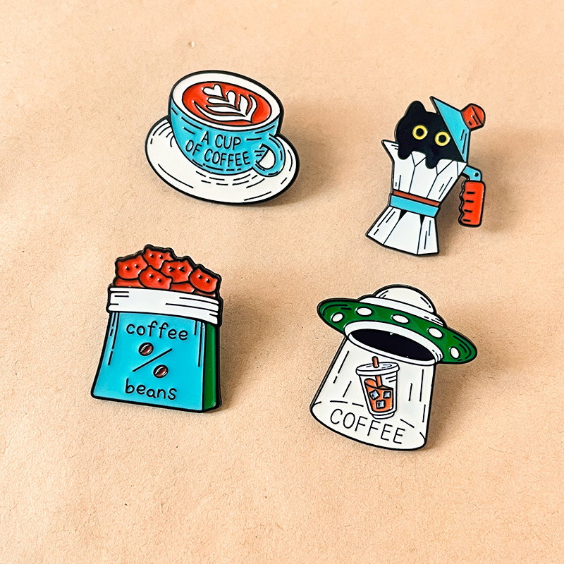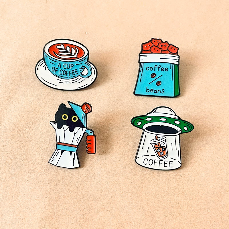 This coffee-themed pin set has 4 glossy enamel designs (UFO coffee, latte, bean bag, cat brewer)—playful nods to caffeine culture. For coffee lovers, it adds quirky, cozy flair to bags/jackets, ideal for daily styling or café-themed accessory decor.