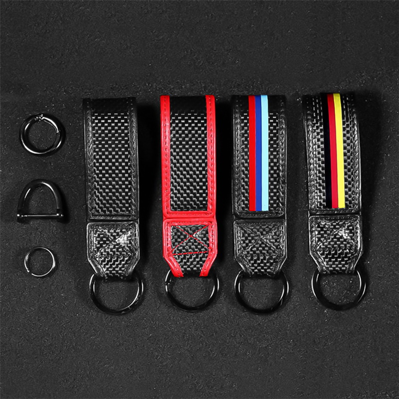 These carbon fiber keychains feature unique color stripes (red, blue-red-blue, red-yellow), offering car enthusiasts personalized, sporty accessories that stand out, perfect for showcasing automotive passion with distinctive design.