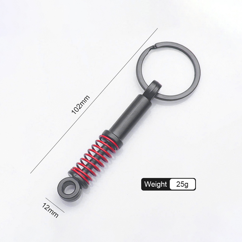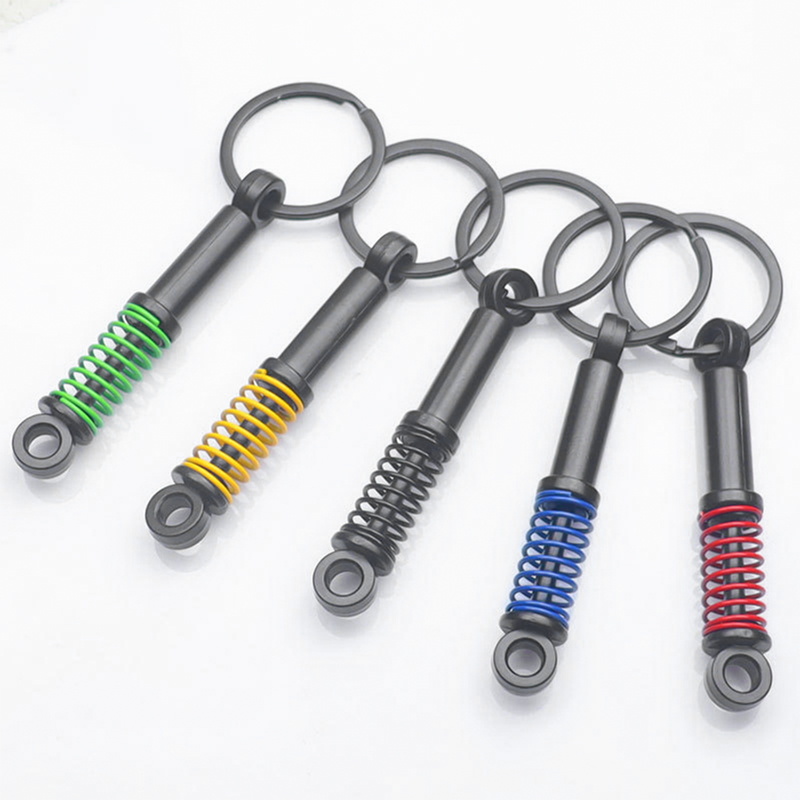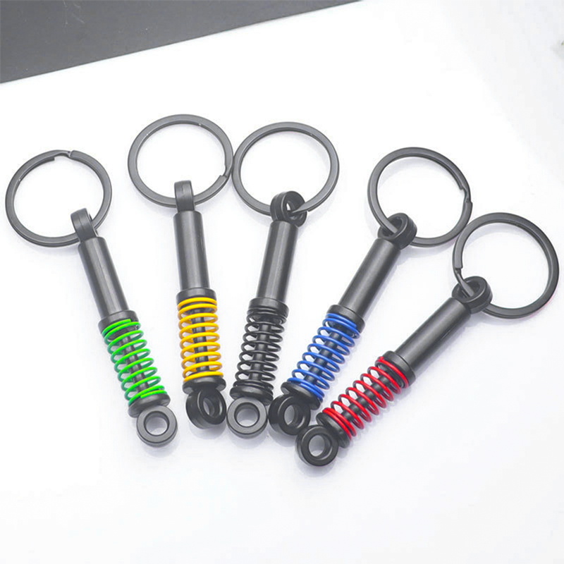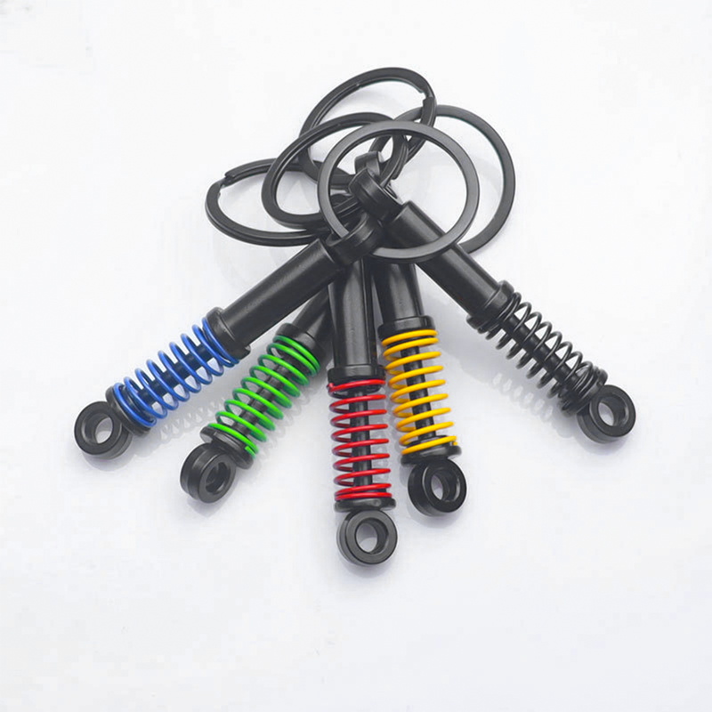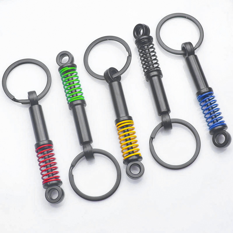 This keychain adopts a shock absorber design, with colorful metal springs (green, yellow, black, blue, red) and black plastic/metal hardware. It presents a mechanical, industrial style, combining automotive-inspired elements and durable materials for a stylish, rugged aesthetic.