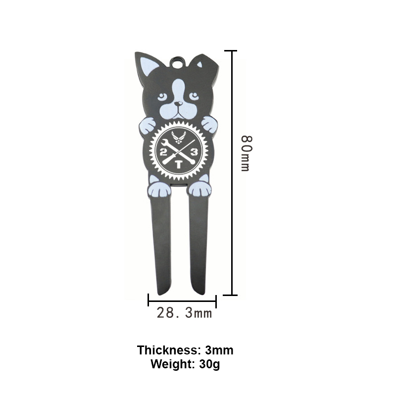 This 80mm compact (30g lightweight) divot tool features a charming Boston Terrier design (black/white finish) with a functional repair tip. Durable, cute, and easy to carry—perfect for green maintenance, adding a playful, personalized touch to any golfer’s gear.