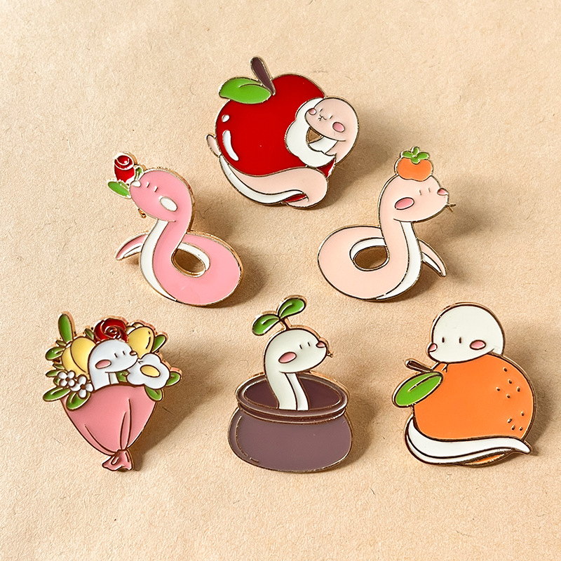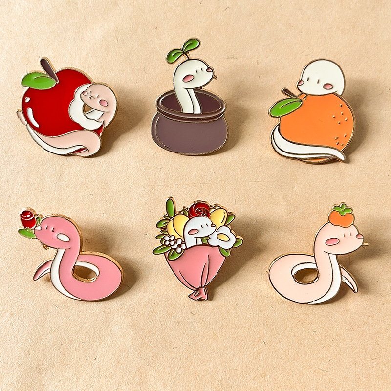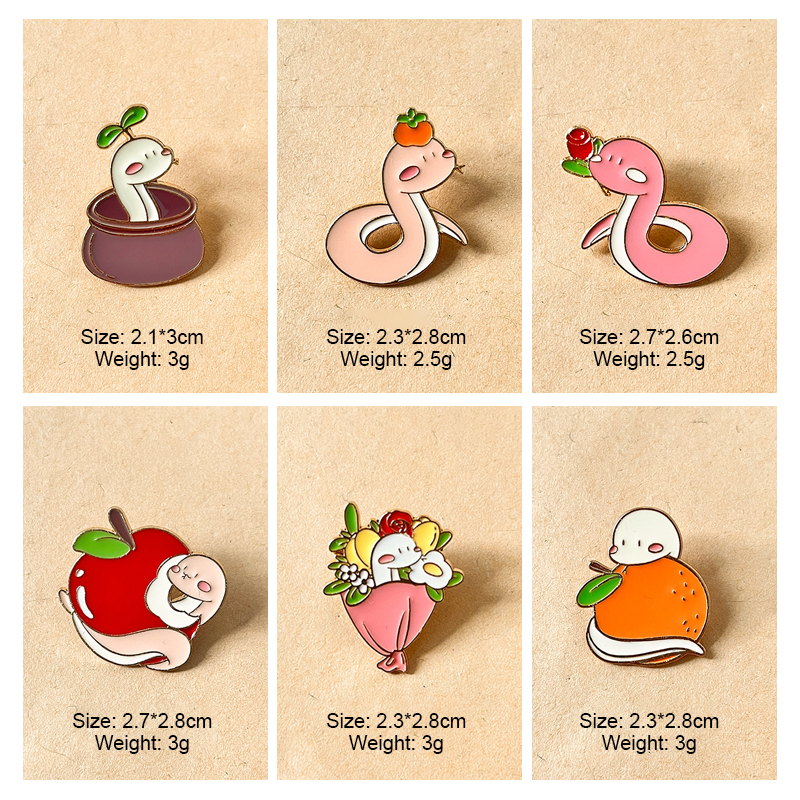 These 6 adorable snake pins feature whimsical designs (paired with fruits, flowers, and more)—playful, charming flair. Ideal for animal lovers to add cute, eye-catching style to bags/jackets; great for daily wear or quirky, whimsical decor.