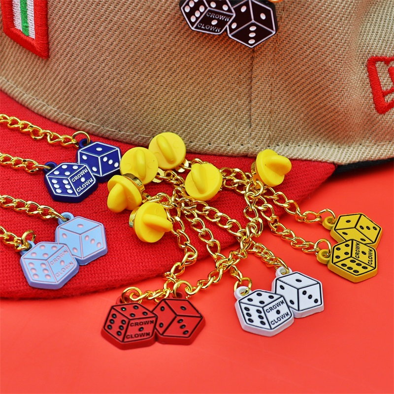 Vibrant yellow/blue dice (with "Crown Clown" text) paired with gold chains & Rubber accessories—playful, bold accessories to elevate hat styling.