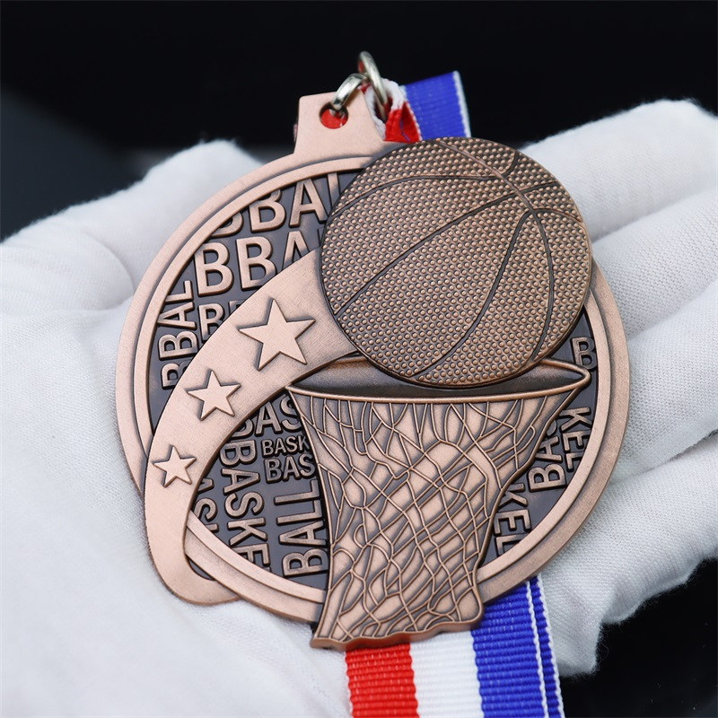 This vivid basketball medal (gold/silver/copper metal) boasts tactile 3D basketball and net details, paired with bold repeating "BASKETBALL" lettering and sharp star accents. Its lively, game-centric design captures hoops energy, serving as a striking, well-suited honor for celebrating basketball tournament wins.