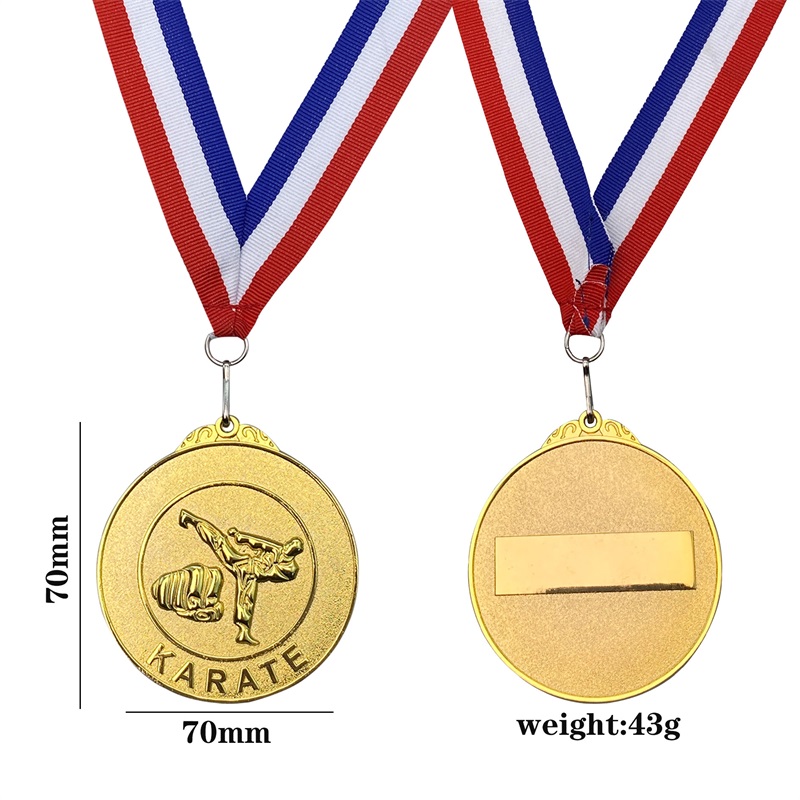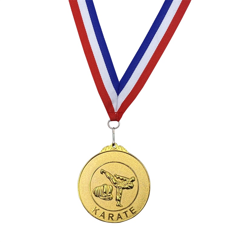This karate medal (gold/silver/copper metal) features embossed motifs of a dynamic kick and fist—iconic of martial arts skill—paired with bold "KARATE" lettering. Framed by polished edges, its design mirrors the discipline of karate, making it a fitting honor for tournament achievements.