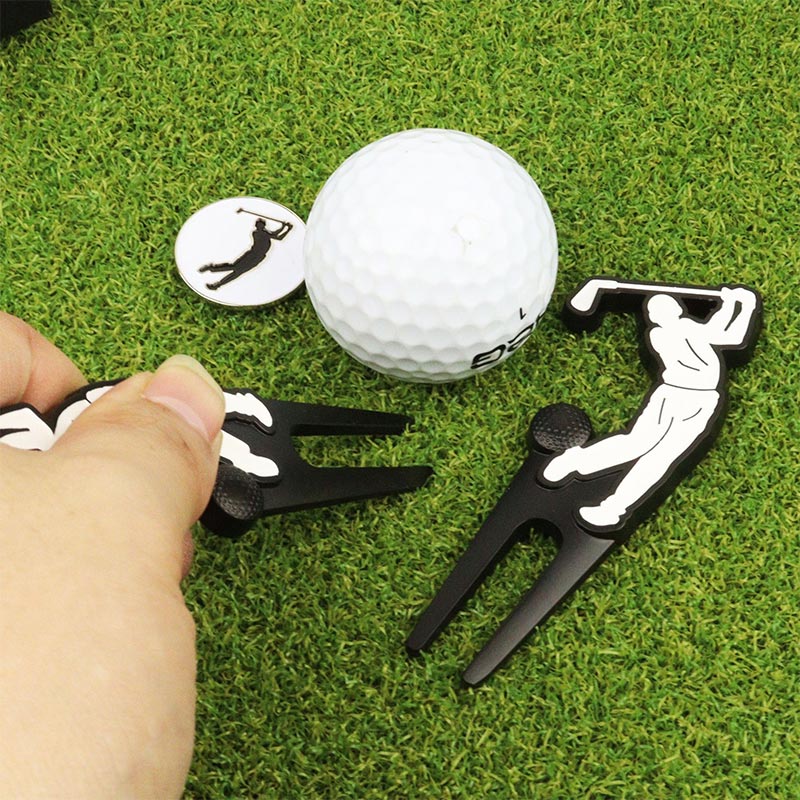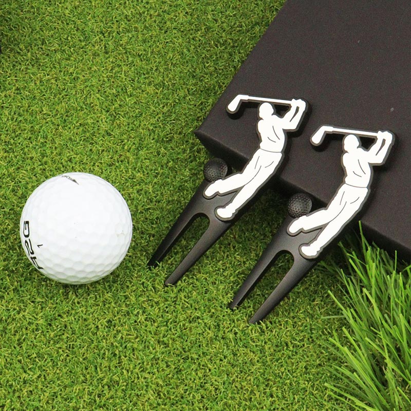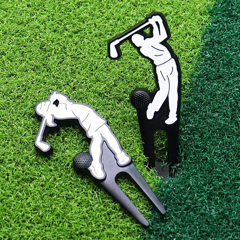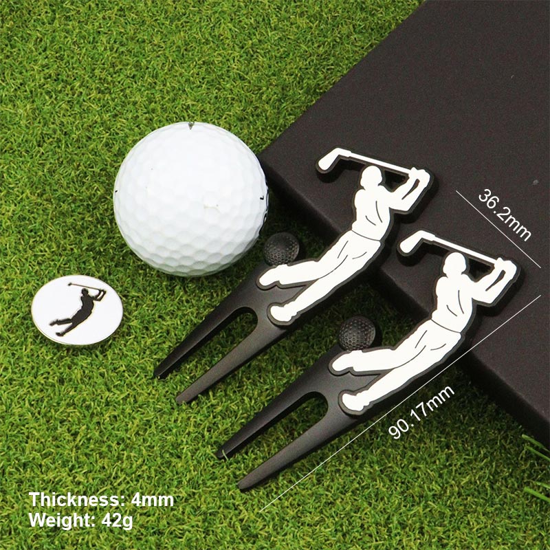 This 42g (90.17mm) tool features dynamic golfer silhouettes (male/female) in black & white. It includes a matching ball marker, has a 4mm thick durable build, and simplifies green repairs—stylish, functional, and perfect for adding on-course personality.