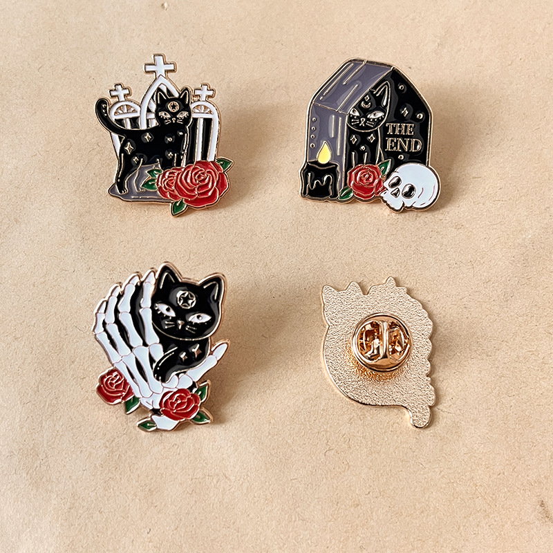 This gothic black cat pin set has 4 dark-chic designs (cat + cemetery/coffin/skeleton) paired with red roses—moody, occult charm. For goth lovers, it adds edgy flair to bags/jackets, ideal for alternative styling or infusing outfits with spooky, stylish dark personality.