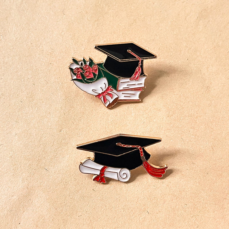 2 elegant pins (cap with book/bouquet, cap with diploma) — sleek black, vivid red accents. Perfect for graduates to mark milestones on bags/jackets; ideal as meaningful academic collectibles or gifts.
