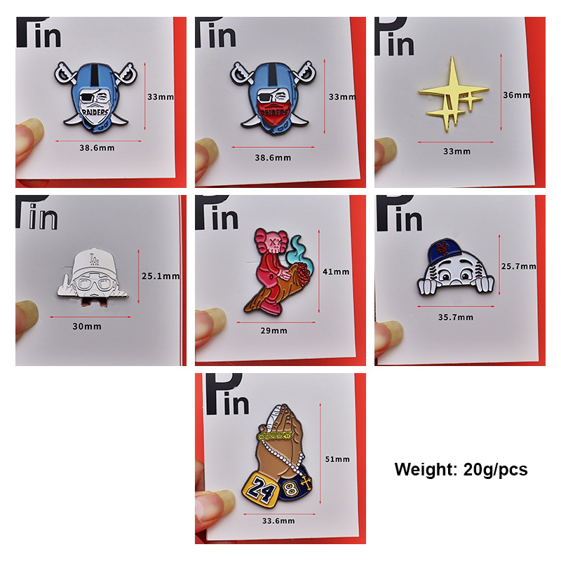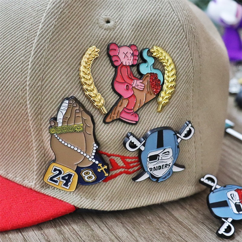 Unique designs (praying hands, character motifs, sports themes) with bold colors & detailed craftsmanship—stylish, eye-catching accessories for hats/bags.