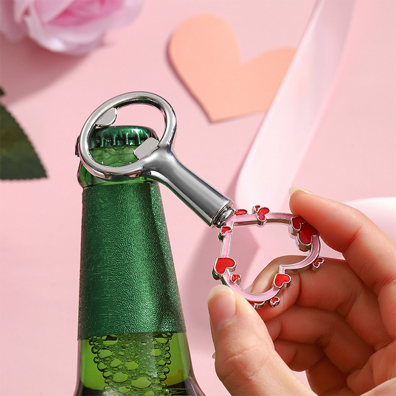 This 37g (9cm) opener features a large heart frame dotted with tiny red hearts, in glossy gold/silver. It pops caps easily, radiating romantic charm—ideal for engagement parties, anniversary events, or a sweet gift for heart-themed gathering lovers.