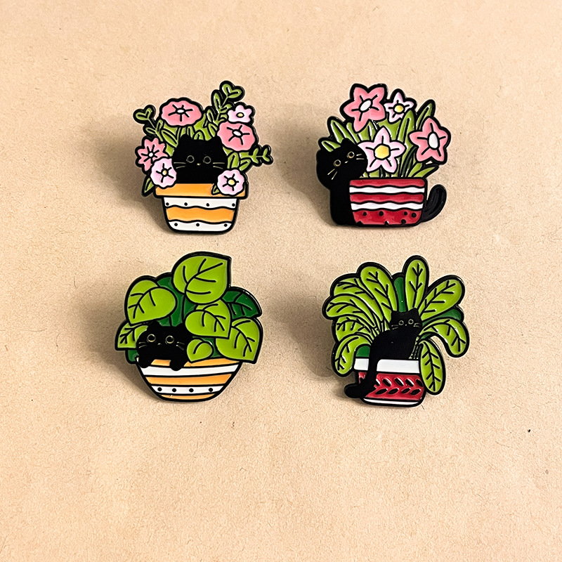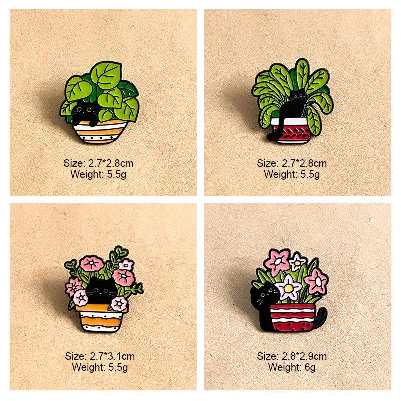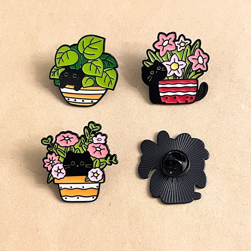 Features 4 cute designs of black cats peeking from flower/leaf pots—charming, cozy garden flair. Perfect for cat/plant lovers to add playful charm to bags/jackets, ideal for daily styling or whimsical decor.