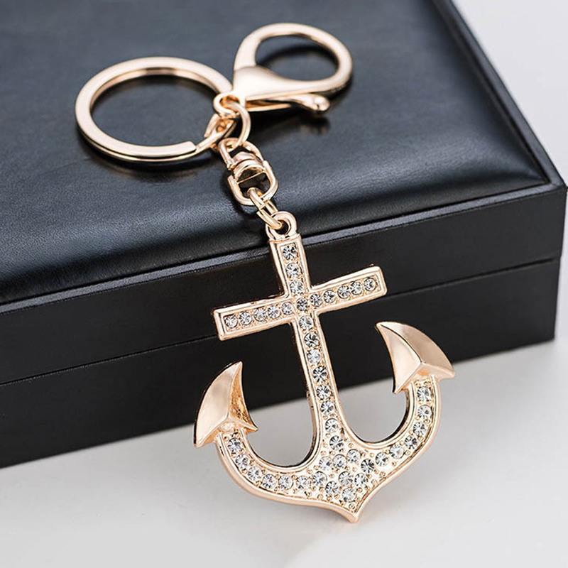 This gold-toned anchor keychain is adorned with rhinestones, featuring an elegant design, perfect for adding a sparkling touch to your keys or as a stylish accessory.