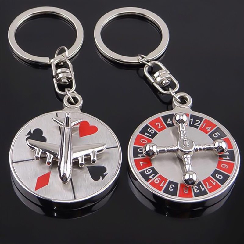 These metal keychains feature airplane and roulette designs, are rotatable, stylish, and ideal for gaming enthusiasts to organize keys or as unique accessories.