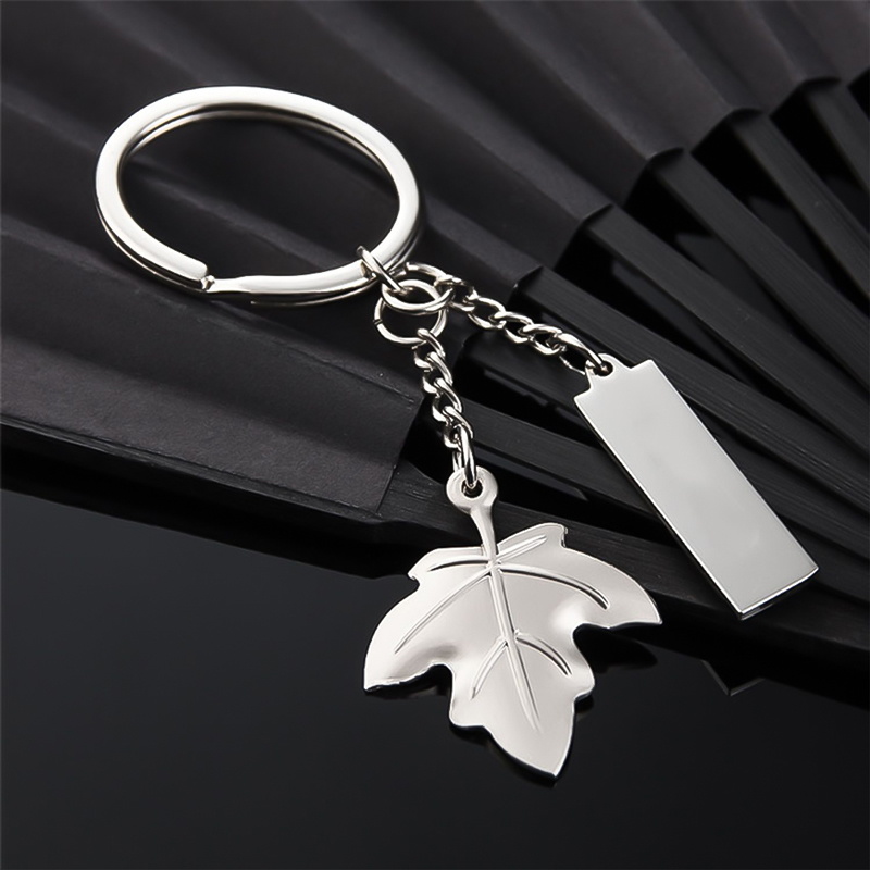 This silver metal keychain showcases a detailed maple leaf charm and a blank tag, made of premium metal. Stylish, durable, and ideal as a personalized gift for loved ones, perfect for gifting on occasions like birthdays or as a unique key organizer accessory.