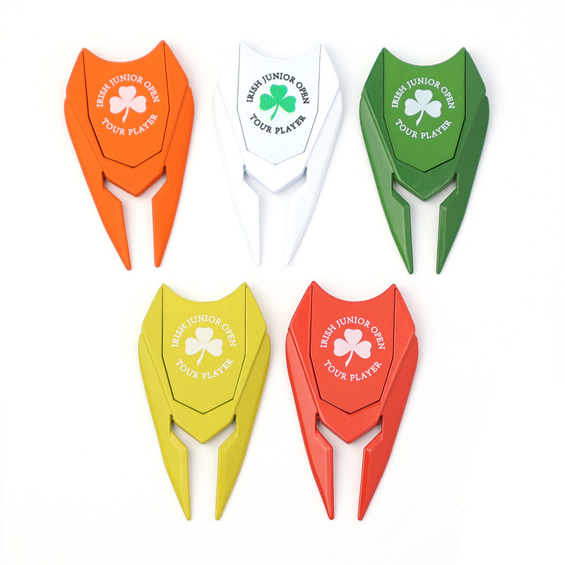 This 31g (64mm) tool features "Irish Junior Open Tour Player" branding + 4-leaf clover, in 5 hues (orange/white/green/yellow/red). At 5.7mm thick, it’s lightweight, durable for green repairs, and perfect for commemorating the event or adding themed flair to rounds.