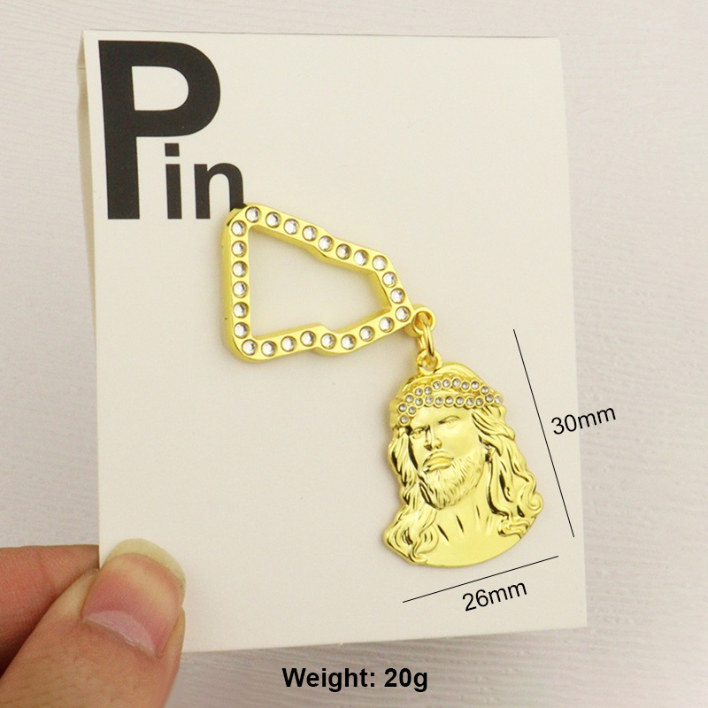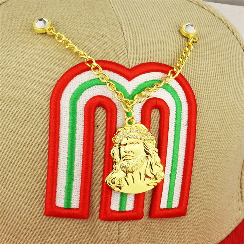 Stylish Cap DecorFeaturing gold rhinestone-trimmed Jesus head pendants, a gold chain, and yellow rubber fittings—these eye-catching pins add unique flair to caps.