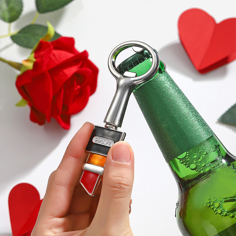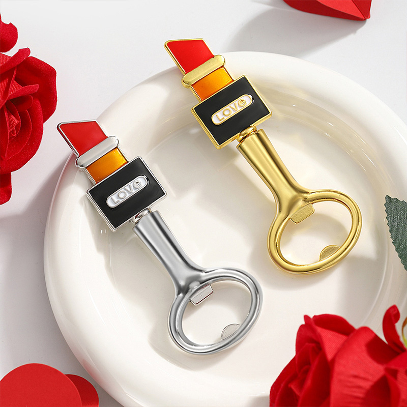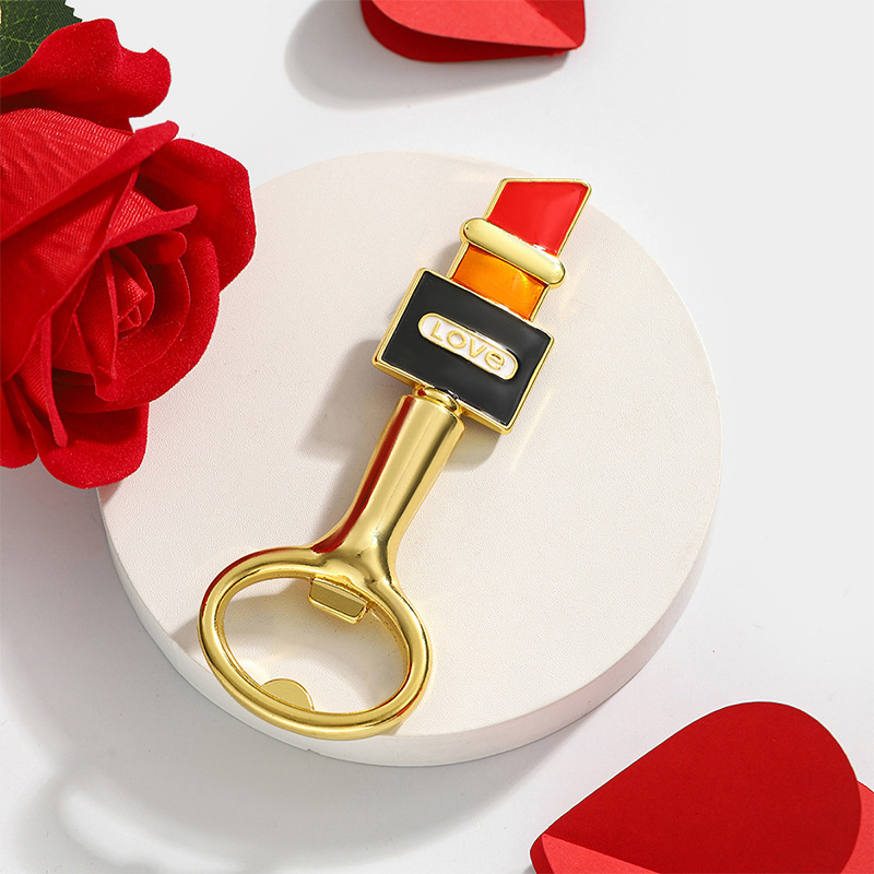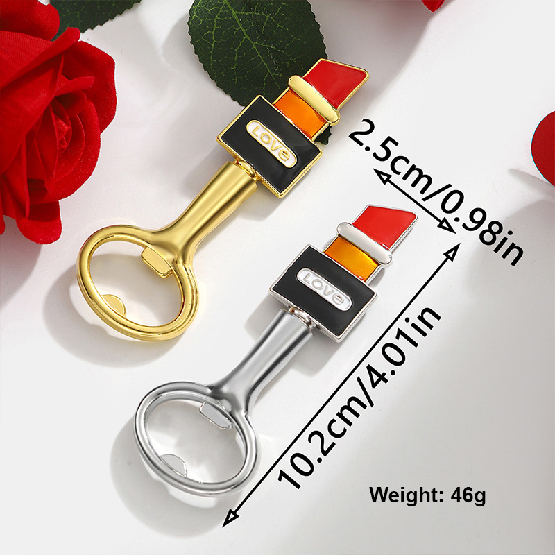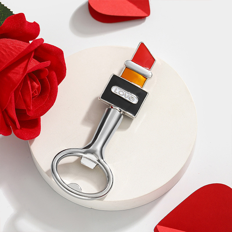 This 46g (10.2cm) opener mimics a vibrant lipstick (red-orange enamel) with a "LOVE" label, paired with gold/silver handles. It pops caps smoothly, blending romantic beauty-themed charm with playful style—ideal for Valentine’s events, bachelorette parties, or a cute gift for makeup lovers.