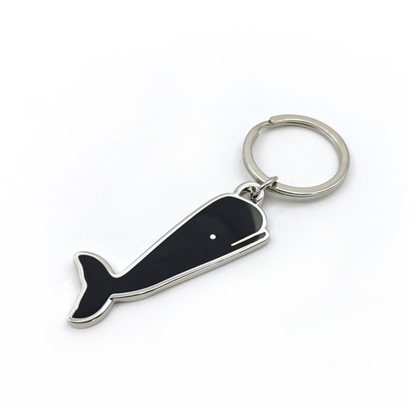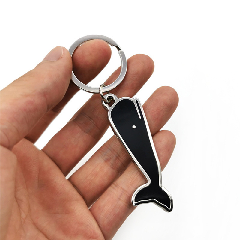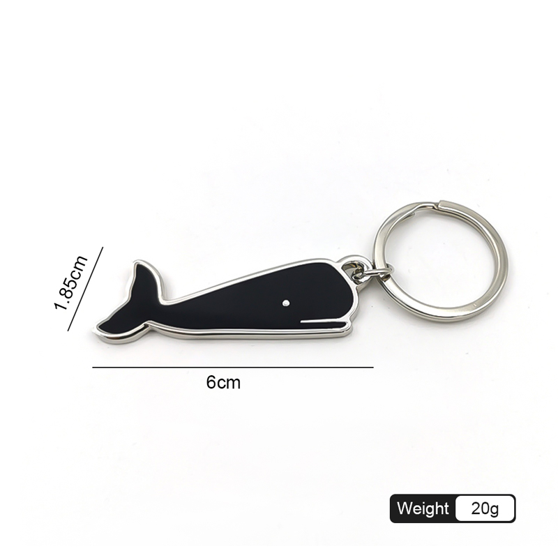 These whale-shaped keychains are crafted from metal, with black enamel filling and silver metal edges. They come with silver key rings, and a dot serves as the eye detail, presenting a delicate and stylish design full of marine-themed charm and texture.