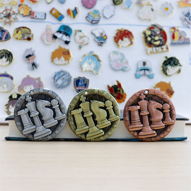 These circular chess medals, finished in antique gold, silver, and copper, boast a distinct star-adorned border. Their raised, detailed motifs (king, knight, rook) sit atop a textured chessboard background. Sleek and thematic, they’re perfect for chess tournaments—honoring players while adding a polished, competitive flair to award ceremonies.