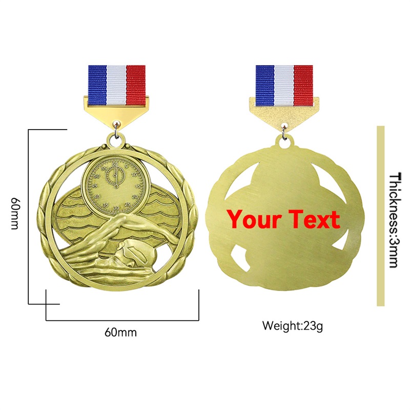 This cut-out swimming medal—finished in antique gold, silver, and copper—boasts an openwork design framing a swimmer motif and stopwatch detail, wrapped in a laurel-inspired border. It blends visual depth with sporty charm, making it a standout award for recognizing achievements in aquatic races and swim events.