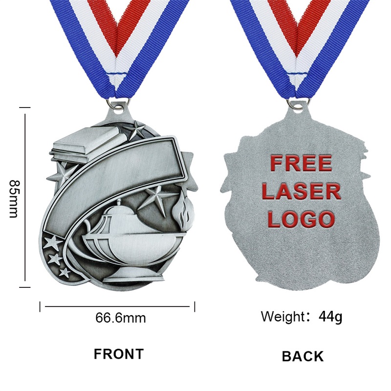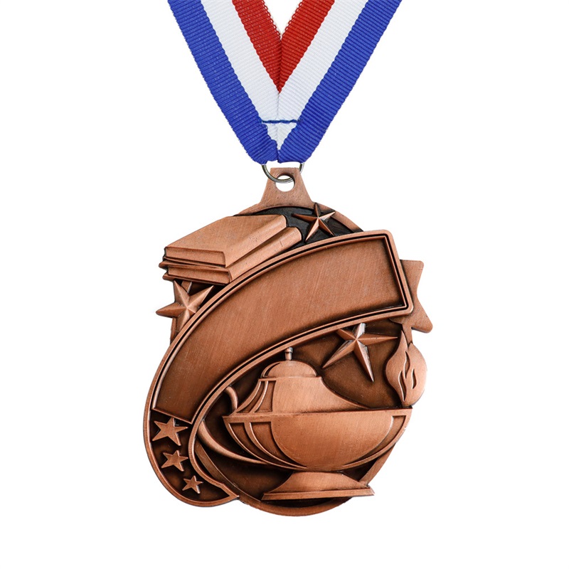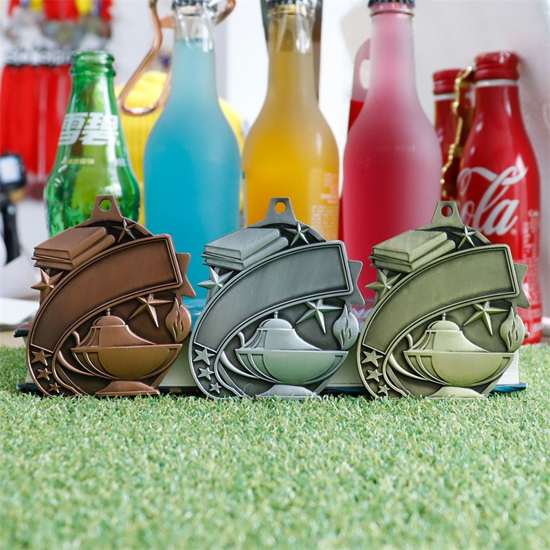 Crafted from antique gold/antique silver/antique red copper metal, this medal blends a weathered, retro finish with embossed academic motifs—books, a lamp (symbolizing knowledge), and stars (representing excellence). It serves as a dignified, nostalgia-tinged honor for recognizing academic milestones: student achievements, scholarship wins, or academic competition successes.
