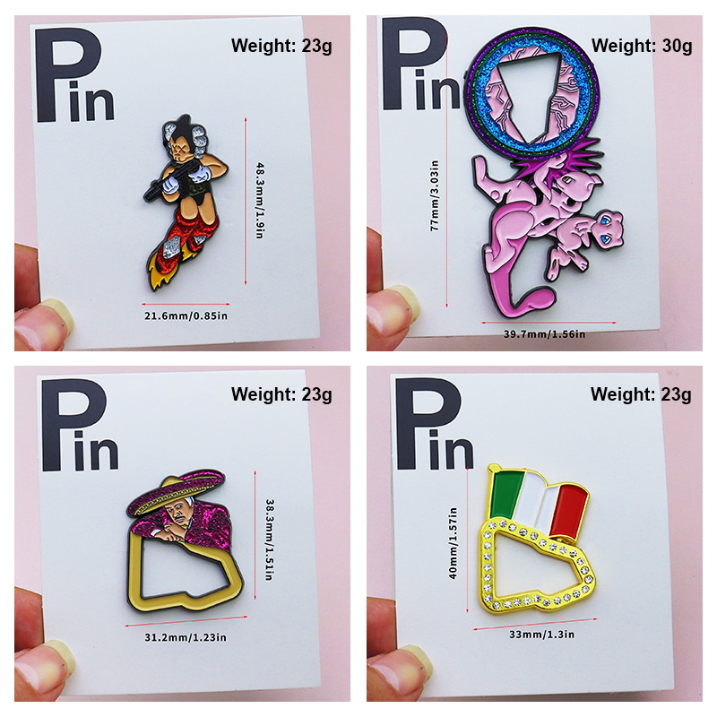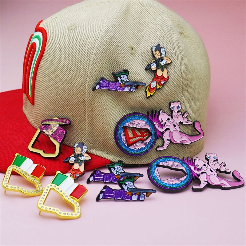 These pins feature diverse shapes: detailed cartoon characters (with weapon/flame details) and rhinestone-trimmed Mexico flag designs. Designed for cap or bag decor, they add bold, unique flair—ideal for cartoon/culture fans to elevate accessories with eye-catching touches.