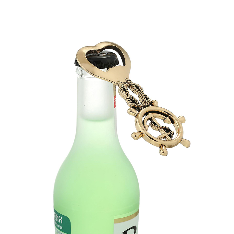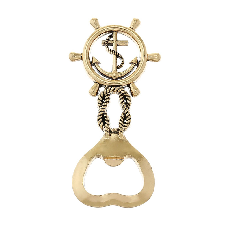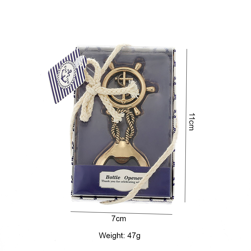 This 47g (11cm) brass opener features a ship wheel + anchor design (with rope details) and a heart-shaped bottle opener. It pops caps smoothly, blending maritime charm with vintage style—ideal for beach weddings, nautical parties, or a thematic gift for sea lovers.