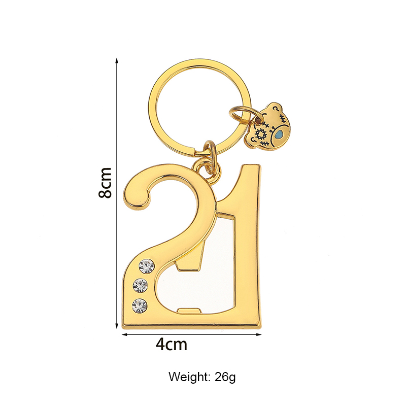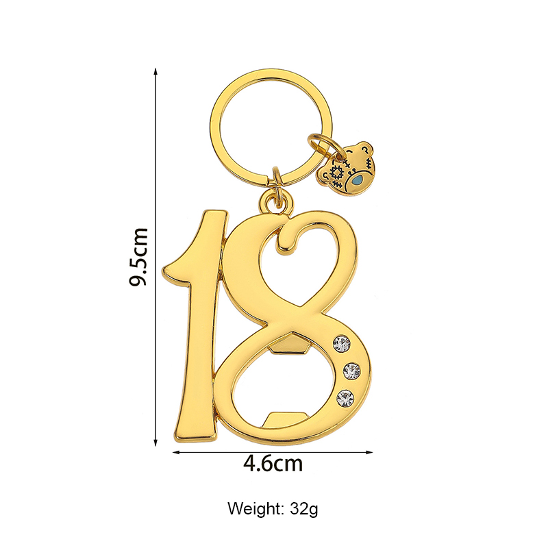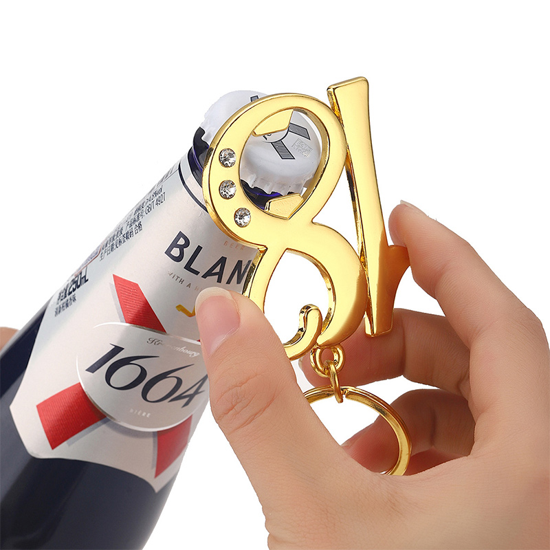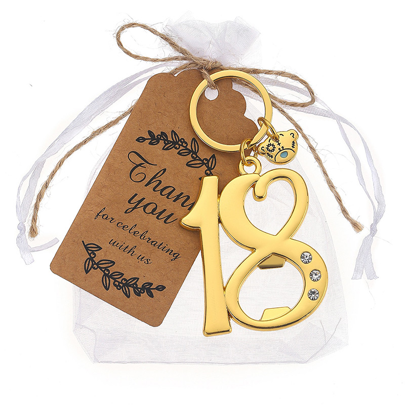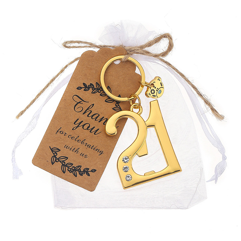 This 26-32g (8-9.5cm) gold opener is shaped like milestone numbers (18/21) with embedded diamonds, doubling as a keychain. It pops caps easily, making it a festive favor for coming-of-age parties, packaged with a "Thank You" tag.