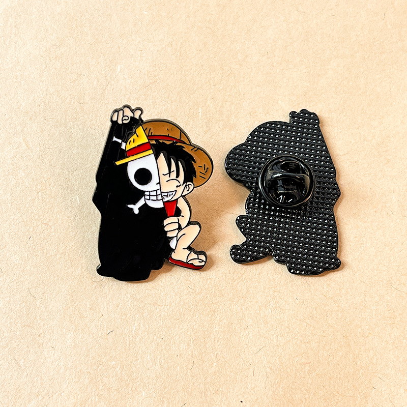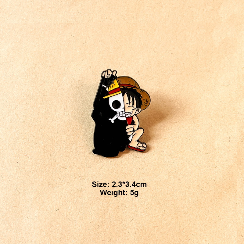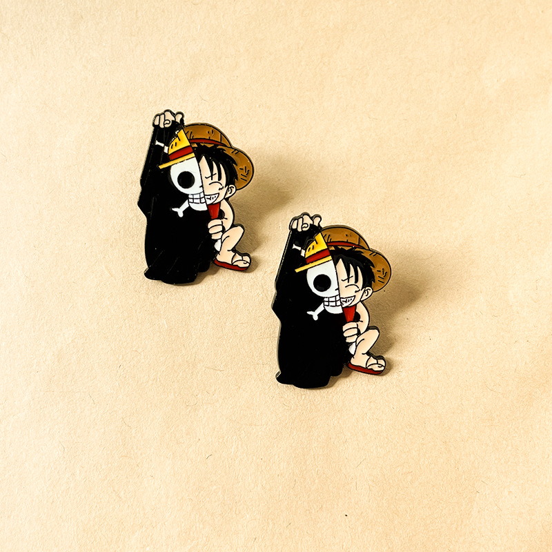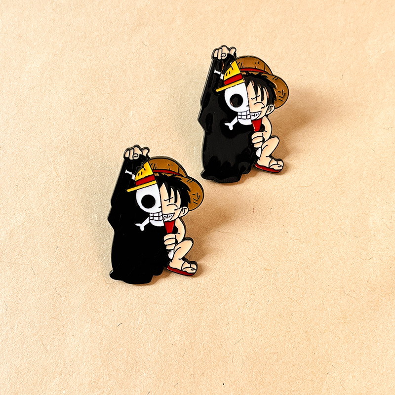 This unique One Piece pin features a creative dual design: half Luffy, half Jolly Roger—bold, eye-catching flair. Ideal for One Piece fans to add pirate-themed style to bags/jackets; great for daily wear or showcasing your anime collectible.
