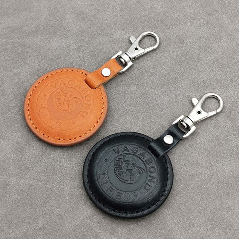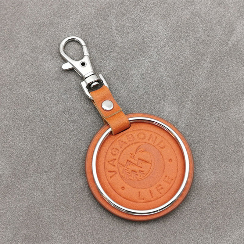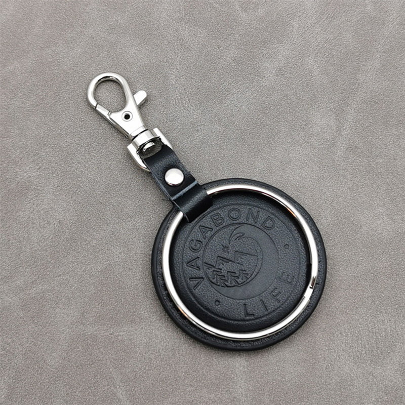 These keychains feature circular leather discs (orange and black) engraved with “VAGABOND LIFE” and a logo, paired with metal rings and clasps. They blend minimalist design and durable craftsmanship, ideal as stylish travel-inspired accessories.
