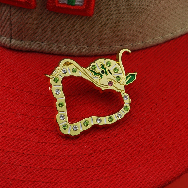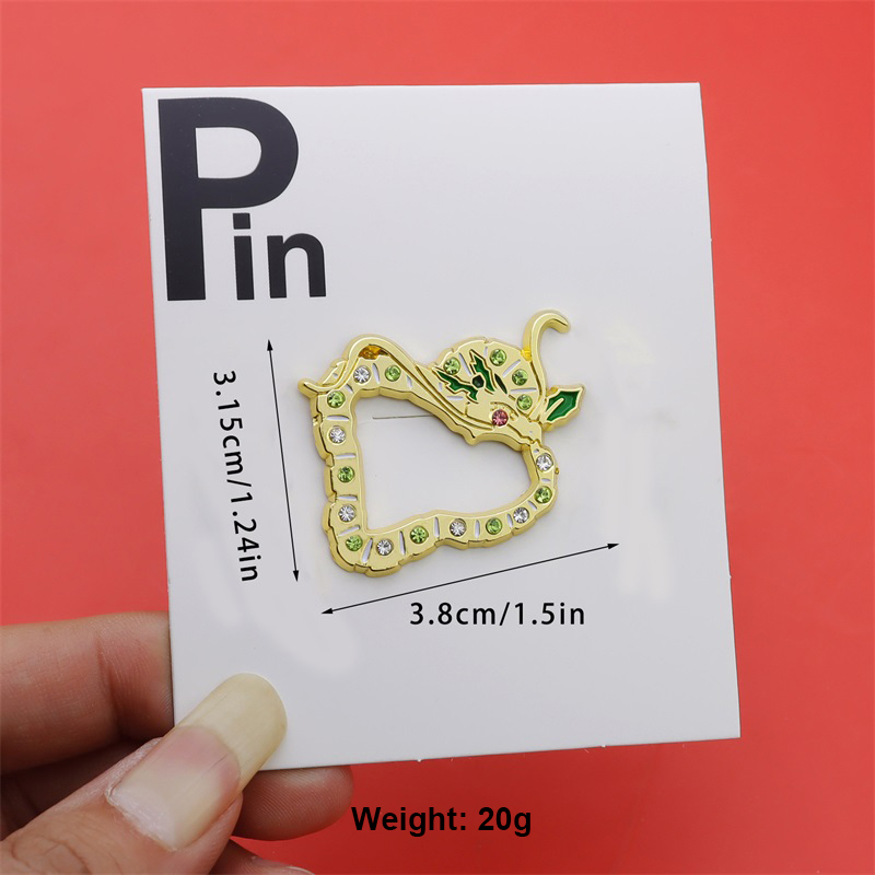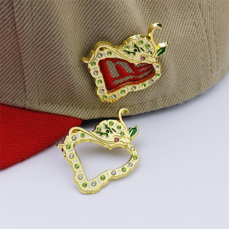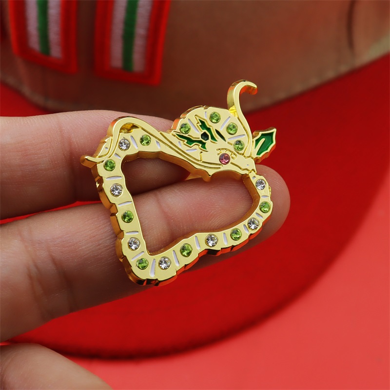 These pins feature hollow, ornate silhouettes (with floral-enamel details), framed in shiny gold and dotted with sparkling green gems. Used to adorn caps or bags, they infuse luxurious, intricate charm—perfect for elevating accessories with eye-catching, opulent flair.