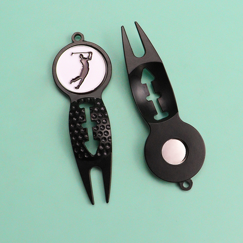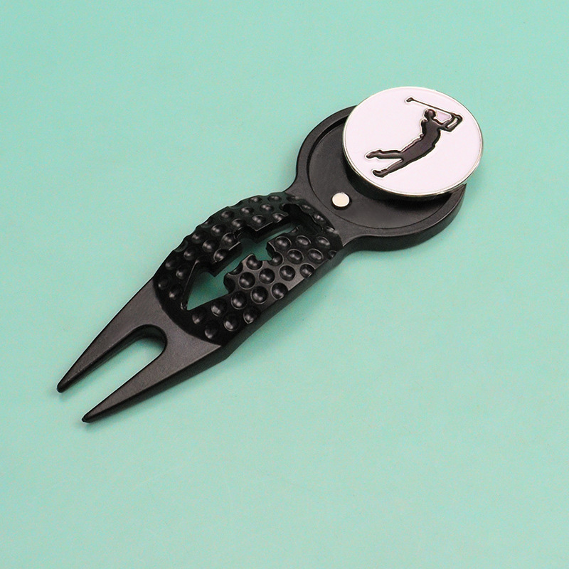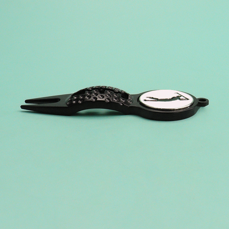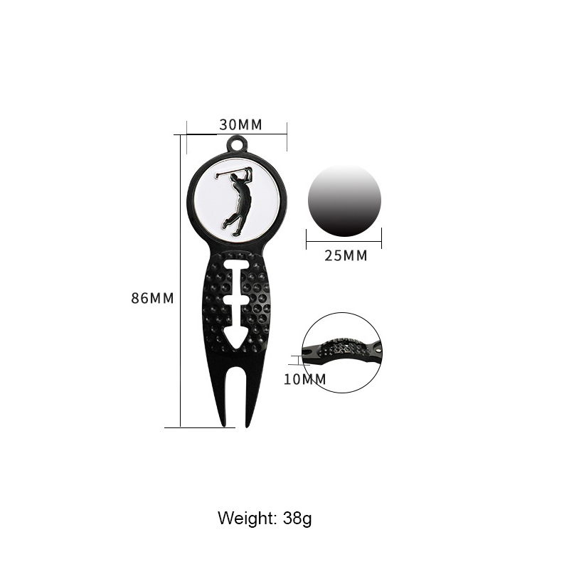 This 38g (86mm) divot tool features a golf player silhouette (black finish) with a textured golf-ball grip area. Durable, functional for green repairs, and designed to echo the sport’s energy—ideal for golfers seeking gear that aligns with their passion for the game.