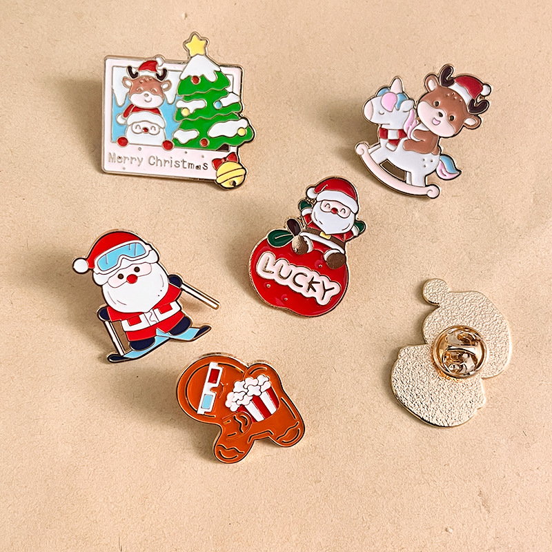 6 whimsical pins (skiing Santa, "Merry Christmas" photo, reindeer rocker, "LUCKY" Santa) — bright enamel, cute holiday details. Perfect for adding cheerful flair to bags/jackets; ideal for Christmas collectibles or festive decor.