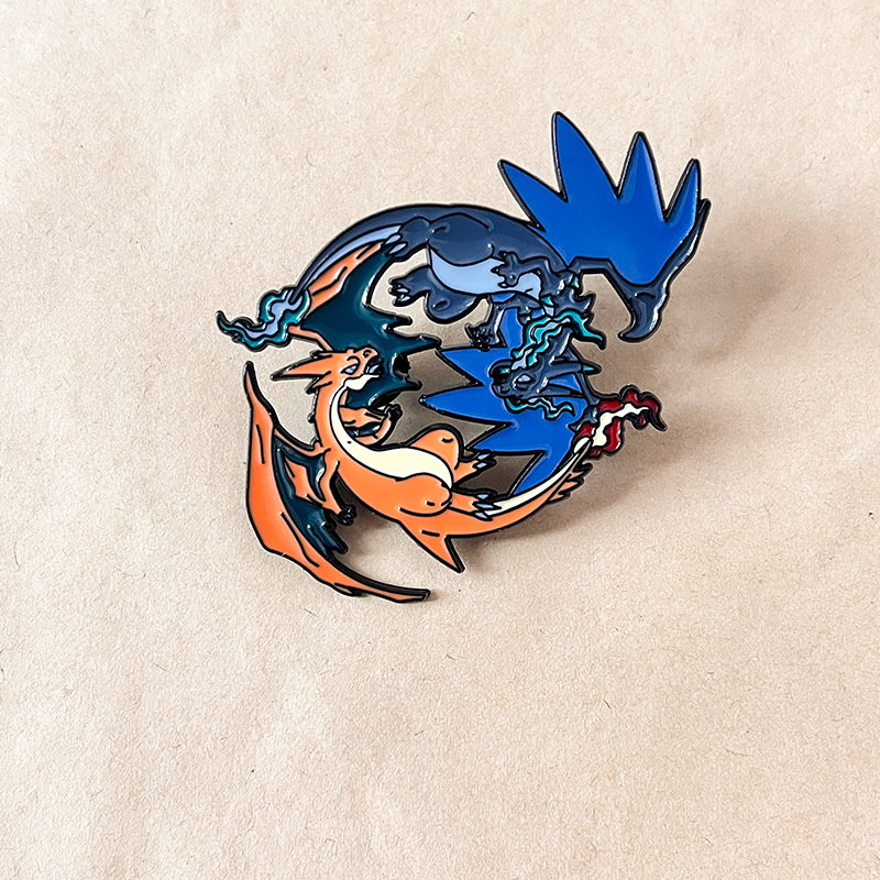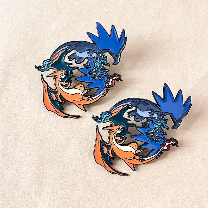 This Pokémon pin showcases iconic red Charizard and shiny blue Charizard in a dynamic, glossy enamel design. For fans, it adds bold, nostalgic flair to bags, jackets, or lanyards—ideal for fandom styling or dragon-themed collectible accessory decor.
