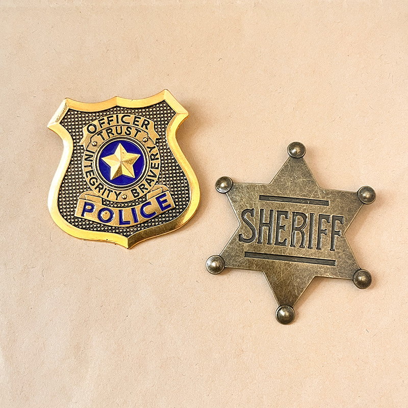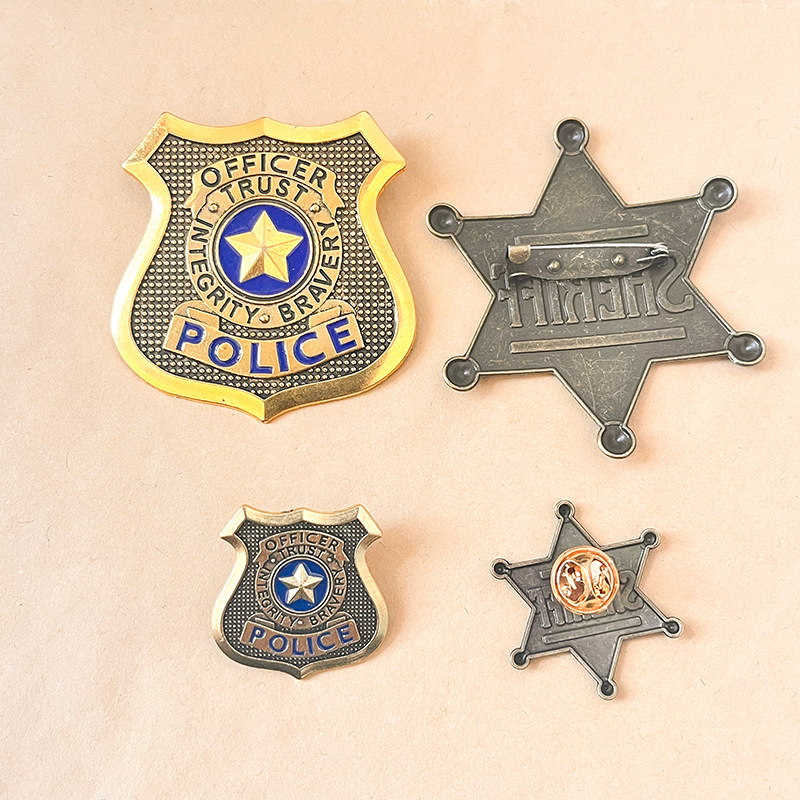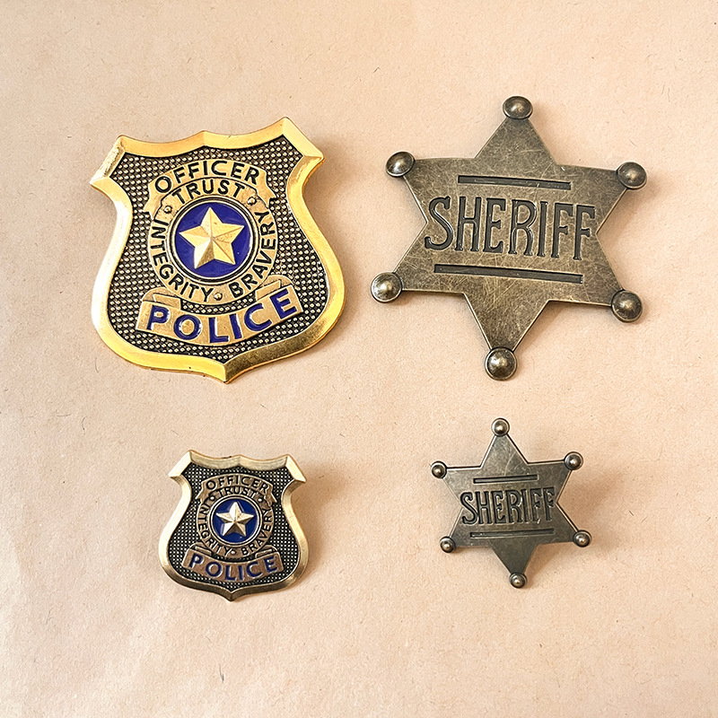 These pins come in shield (Police) & star (Sheriff) shapes, with retro brass/bronze finishes and detailed text. Decorate caps/bags—ideal for law enforcement theme fans craving vintage, iconic accessory flair.