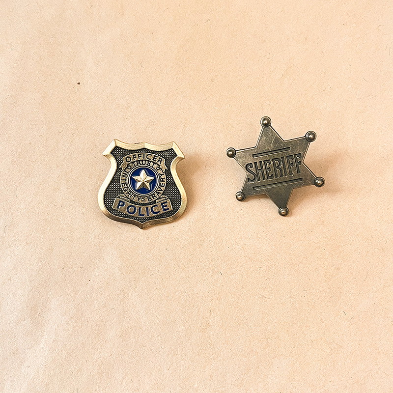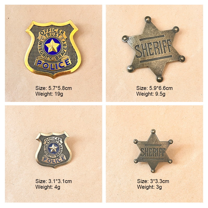 These pins feature two shapes—shield (marked "Police") and star (stamped "Sheriff"), with retro brass/bronze finishes and detailed text. They decorate caps/bags, adding vintage iconic flair, perfect for law enforcement theme fans to craft unique accessory looks.