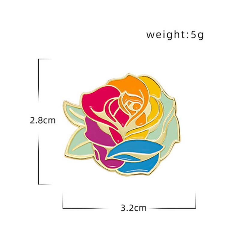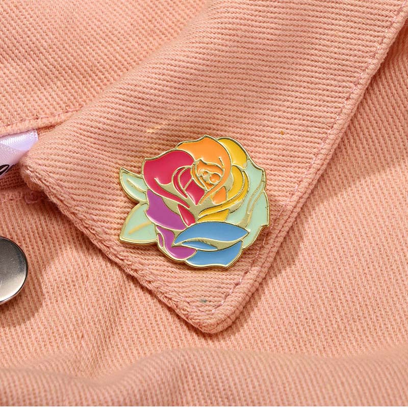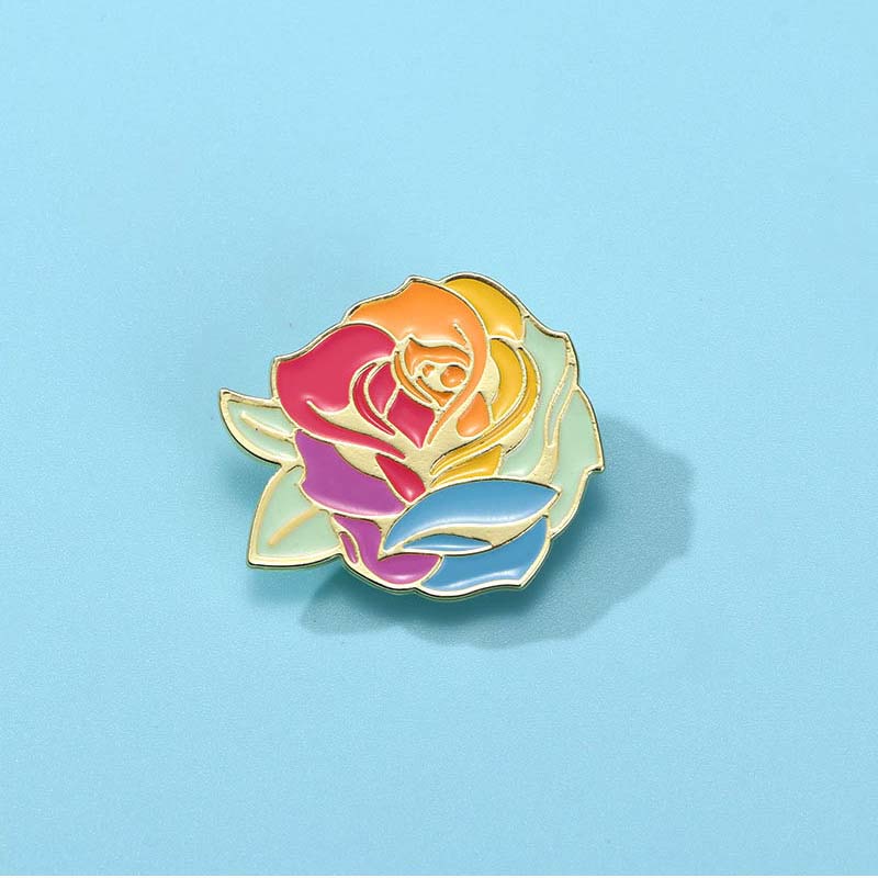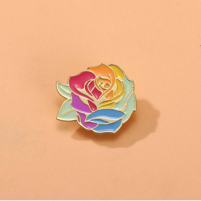 This rainbow rose pin boasts a vibrant gradient design with gold outlines—whimsical, eye-catching botanical charm. For trend/nature lovers, it adds playful flair to bags/jackets, ideal for daily styling or livening up any outfit with colorful floral personality.