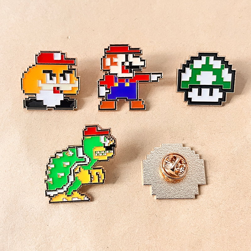 Features iconic Mario characters (Mario, Bowser, mushrooms) in retro 8-bit pixel designs with vibrant enamel. Ideal for gaming fans to decorate jackets, bags, or hats—adding nostalgic, playful charm to daily styles.