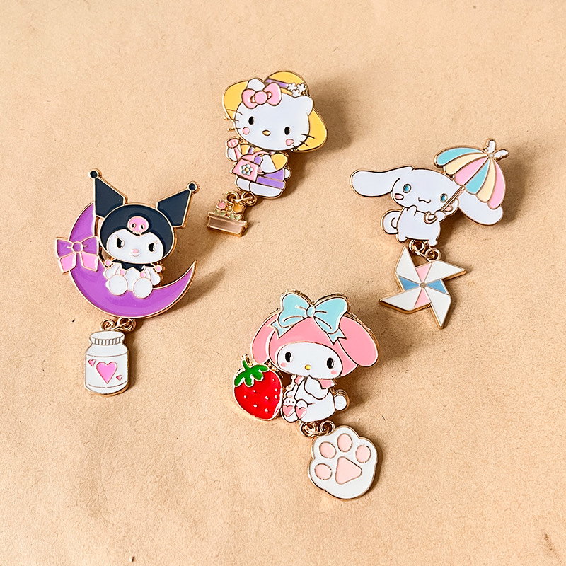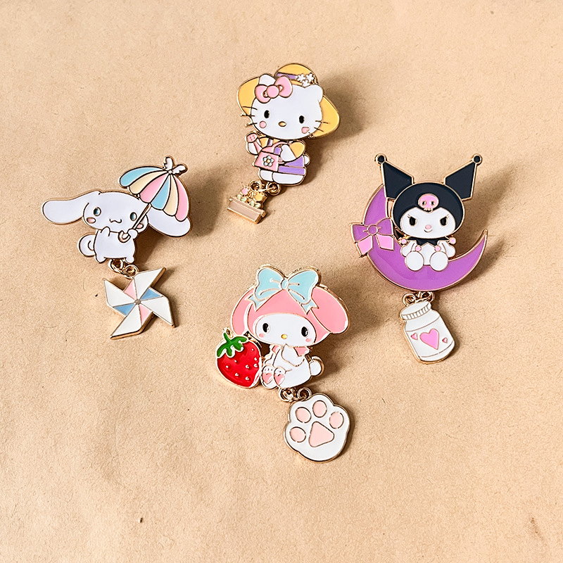 These Sanrio pins have whimsical character-shaped silhouettes (Kuromi on a moon, Cinnamoroll with an umbrella) paired with dangling accents, finished in glossy, pastel enamel. They adorn backpack zippers, blazer lapels, or hat brims—perfect for fans to mix and match, adding cute, playful charm to daily outfits or Sanrio-themed accessories.