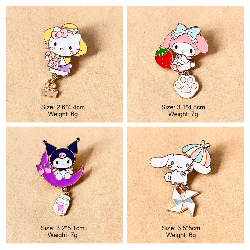 Features iconic Sanrio characters (Kuromi, Hello Kitty, My Melody, Cinnamoroll) with dangling accents (jar, paw print) in vibrant enamel. Ideal for fans to decorate bags, jackets, or hats—adds charming, whimsical flair to daily styles