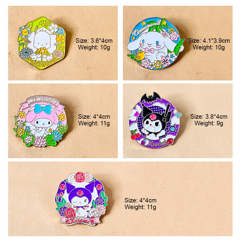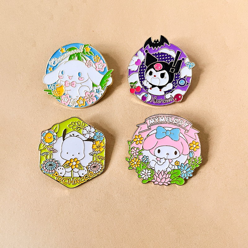 Features Cinnamoroll, Kuromi, My Melody & Pochacco in floral-accented shapes (round, octagon, banner) with vivid enamel. Ideal for fans to decorate bags/jackets—adds cheerful, garden-inspired charm to daily styles or Sanrio collections