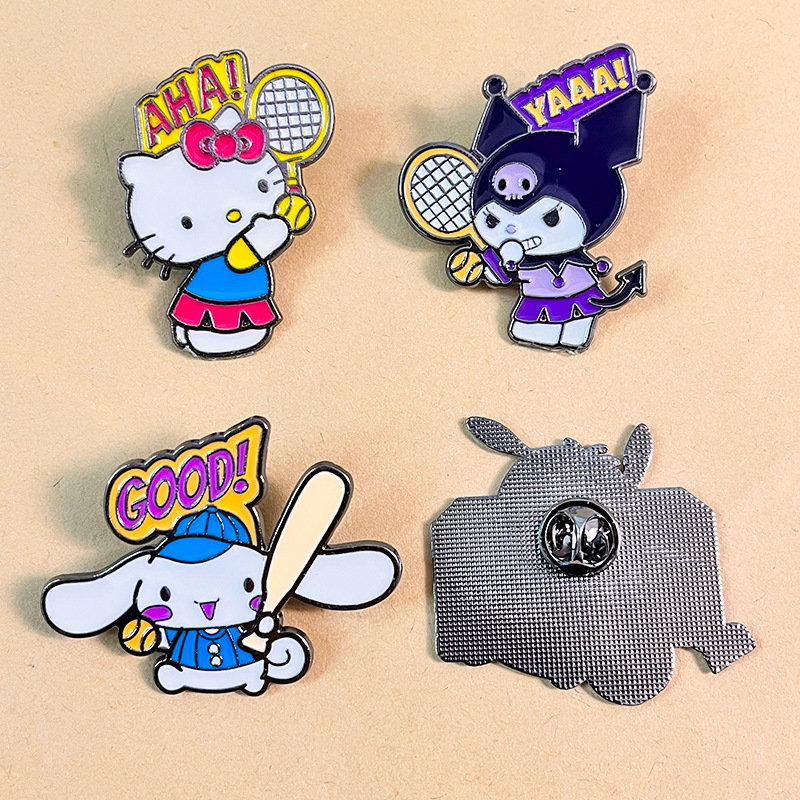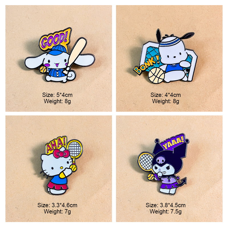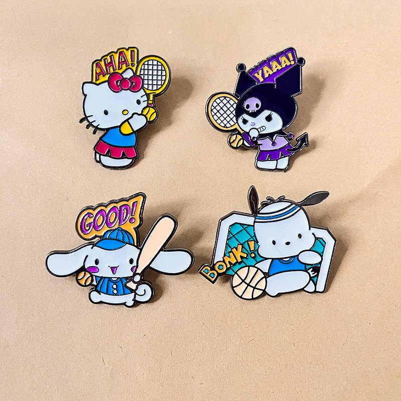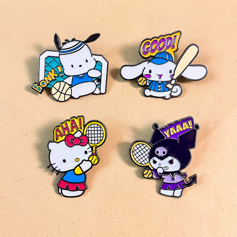These vibrant enamel pins (crisp outlines) feature Sanrio characters (Kuromi, Hello Kitty, etc.) in sports gear, paired with fun exclamations. Blending iconic fandom charm with lively athletic vibes, they add cheerful flair to bags/jackets as beloved collectible keepsakes.