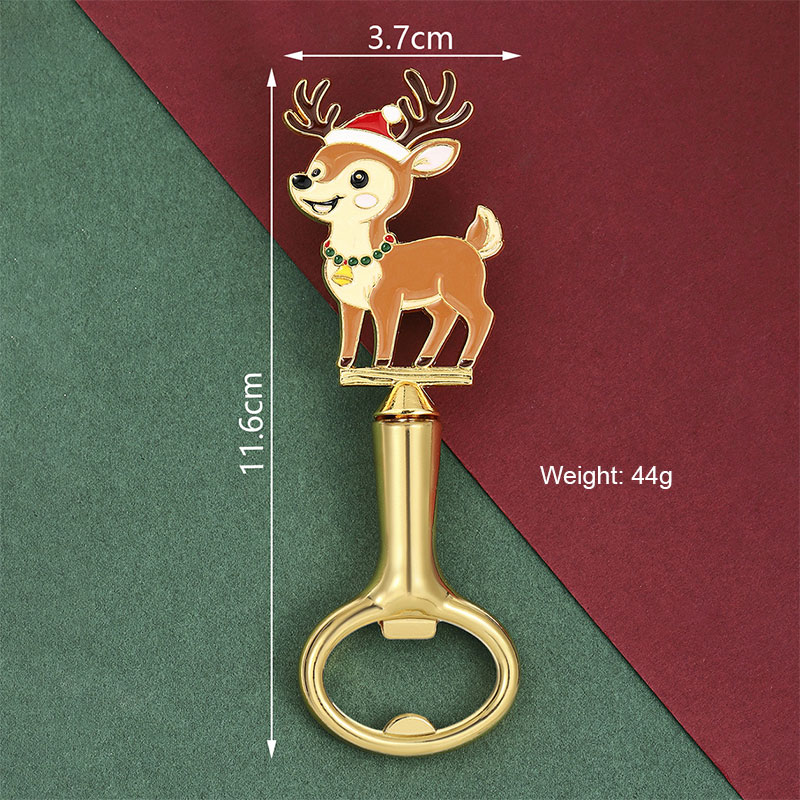 This 44g (11.6cm) opener features a colorful, Santa-hatted reindeer design in gold/silver. It easily pops bottle caps, making it a playful, festive choice for Christmas party favors, holiday gifts, or adding cheerful charm to seasonal barware.