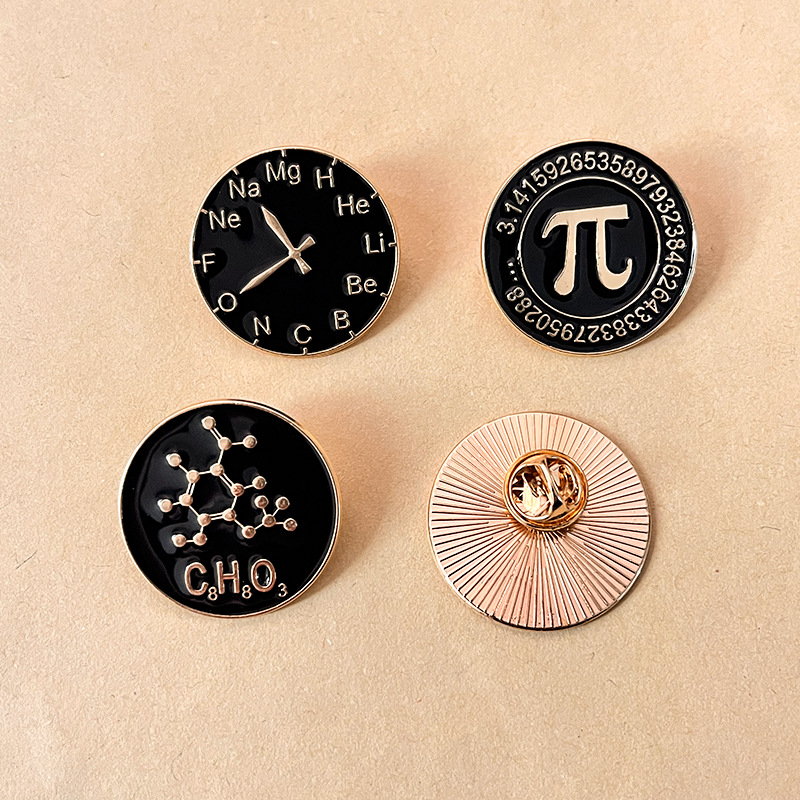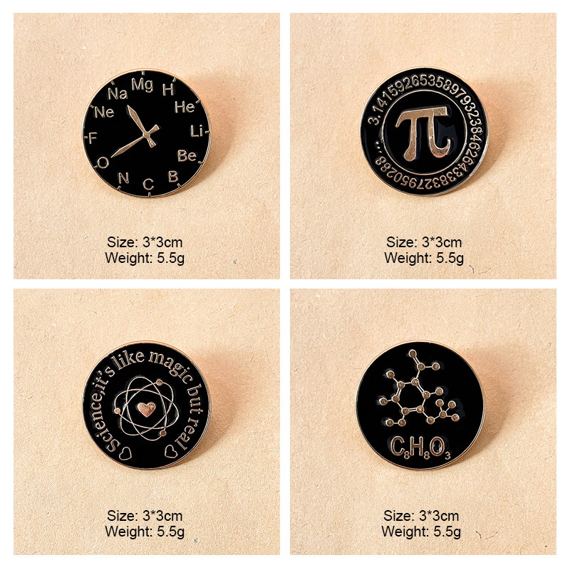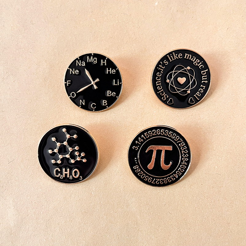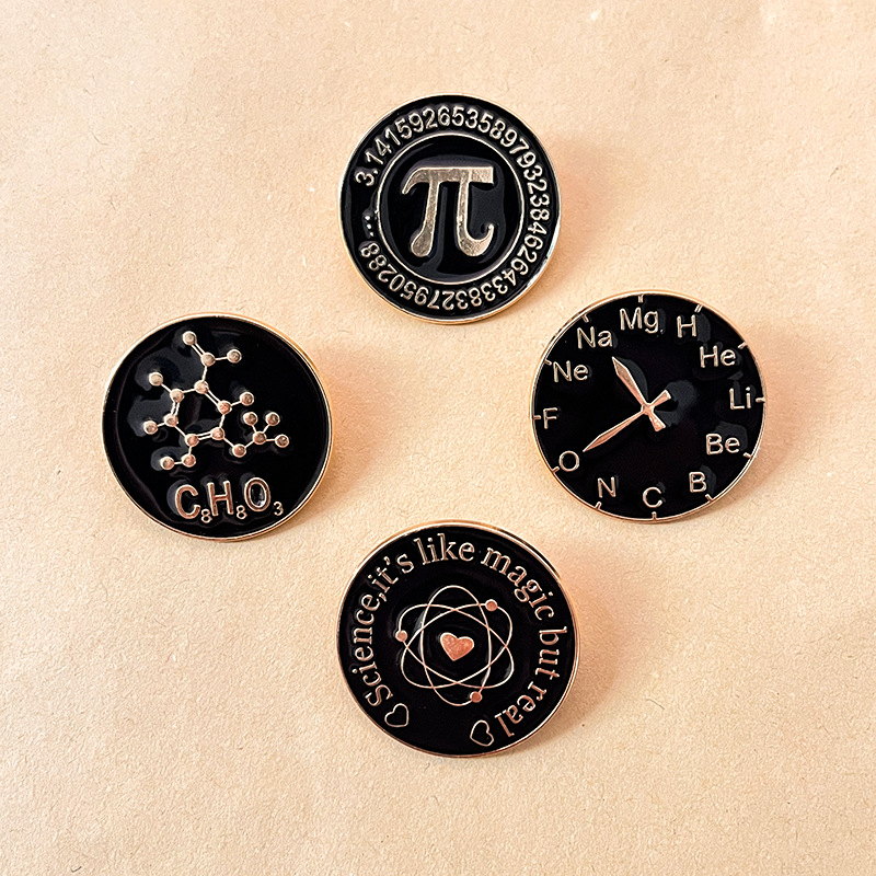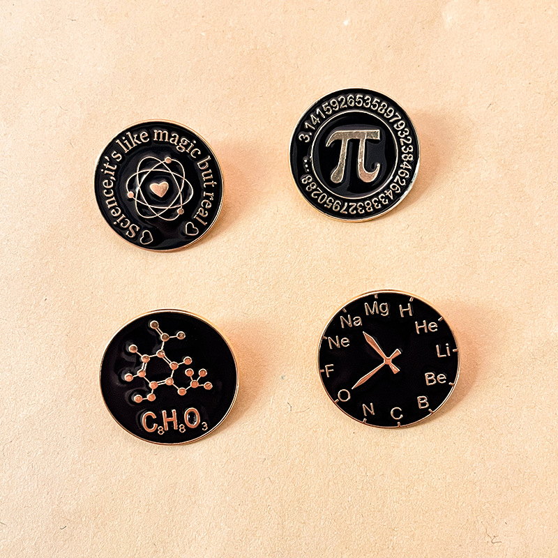 These science-themed pins boast round shapes (periodic table, atom, molecule, π) with sleek black & rose gold detailing. They adorn bags, jackets, or lab coats—perfect for science/math enthusiasts to add witty, intellectual flair to daily items.