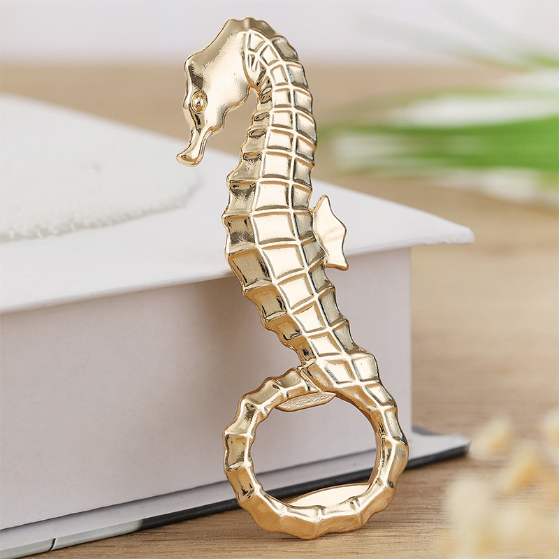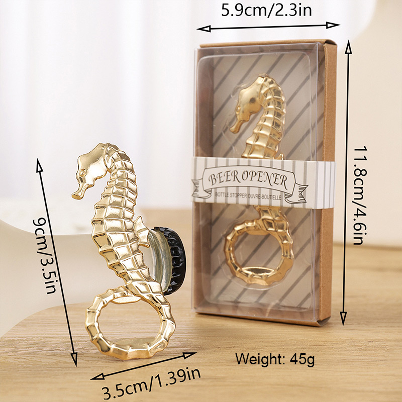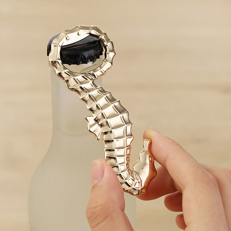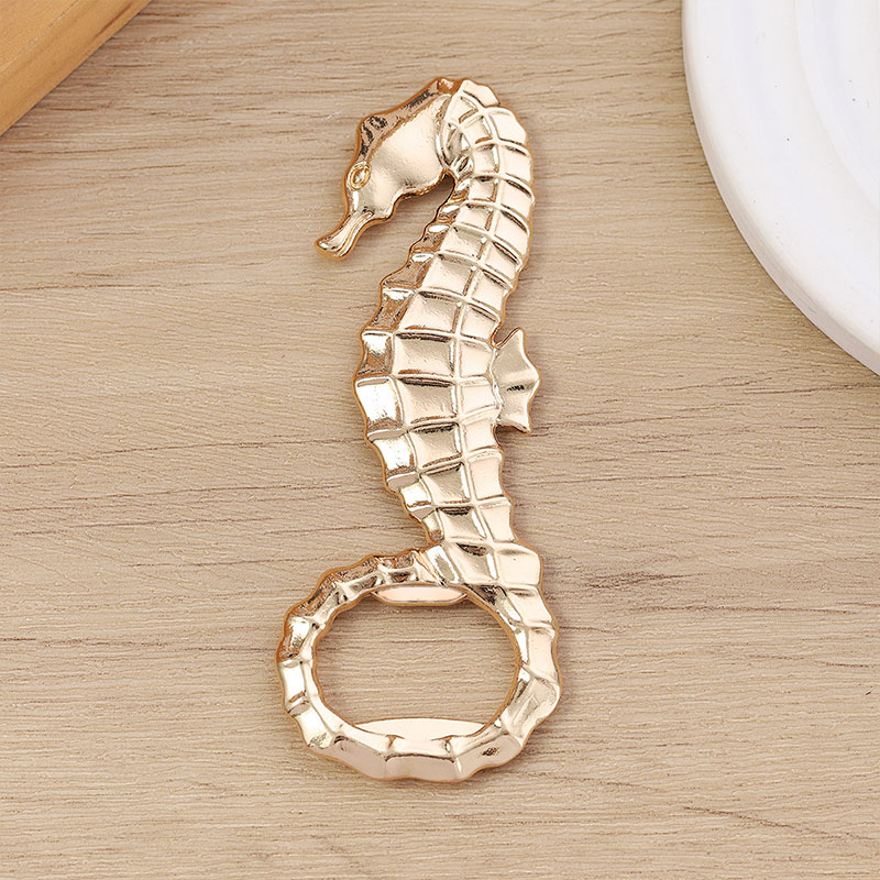 This 45g (9cm) opener is shaped like a textured seahorse (shiny gold finish). It pops caps smoothly, blending coastal charm with decorative elegance—ideal for beach weddings, summer parties, or a whimsical gift for nautical decor enthusiasts.